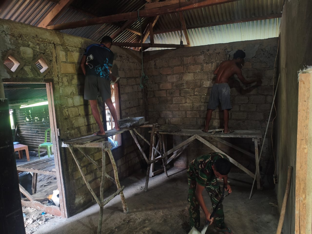 Maybrat PW: Babinsa Koramil 1802-10/Ayamaru Serda H. Sinaga, melaksanakan kegiatan Komunikasi Sosial (Komsos) dengan masyarakat para pekerja yang sedang bekerja membangun rumah salah satu warga Kampung Huberita, Distrik Ayamaru Timur, Kabupaten Maybrat. Sabtu (27/02/2021)..