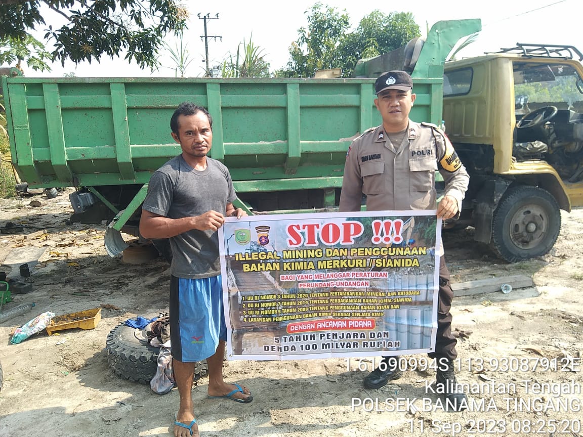 Polres Pulang Pisau, Personel Polsek Banama Tingang, Polres Pulang Pisau, Polda Kalteng Briptu Windi Martiadi menyambangi warga Desa binaan untuk memberikan sosialisasi tentang larangan melakukan kegiatan penambanagan liar / ilegal serta penggunaan bahan kimia merkuri di wilayah Desa Bawan, Kecamatan Banama Tingang, Kabupaten Pulang Pisau, Kalteng, Senin (11/09/2023) Pagi.