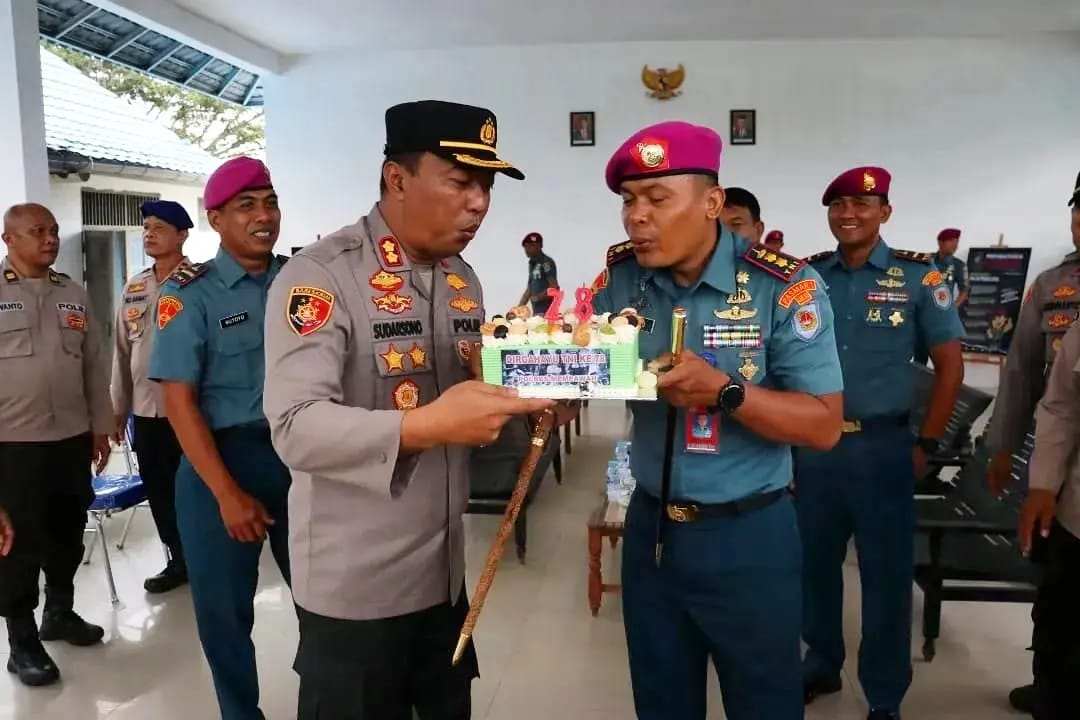 Kapolres Mempawah AKBP Sudarsono, S.I.K., M.SI., bersama jajaran polres Mempawah datang langsung memberikan kue ucapan ultah dan tumpeng ke Markas Komando Yonmarhanlan XII, dan diterima langsung Danyonmarhanlan XII Letkol Marinir Tri Anto, M.Tr.Opsla.