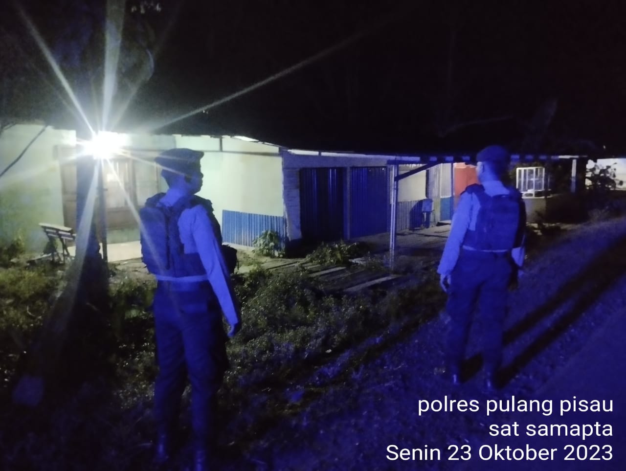 Polres Pulang Pisau Personel Sat Samapta, Polres Pulang Pisau, memastikan aman di pemukiman penduduk yang ada di kota Pulang Pisau, dengan cara melakukan pengecekan ke pemukiman penduduk, seperti yang kita lihat, pada hari Senin (23/10/2023) malam