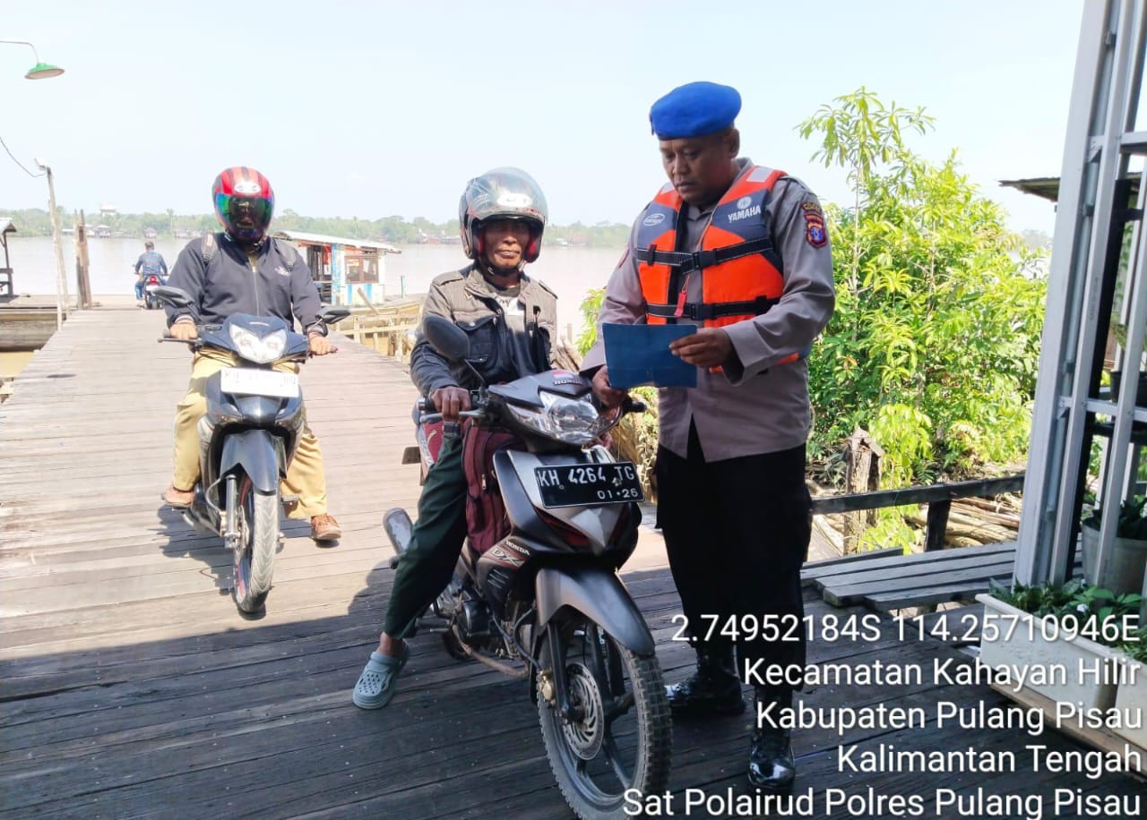 Polres Pulang Pisau Dalam upaya mencegah terjadinya kebakaran hutan dan lahan personel Satpolairud Polres Pulang Pisau , Polda Kalteng Bripka Andi memberikan sosialisasi larangan karhutla kepada masyarakat di bantaran Das Kahayan.