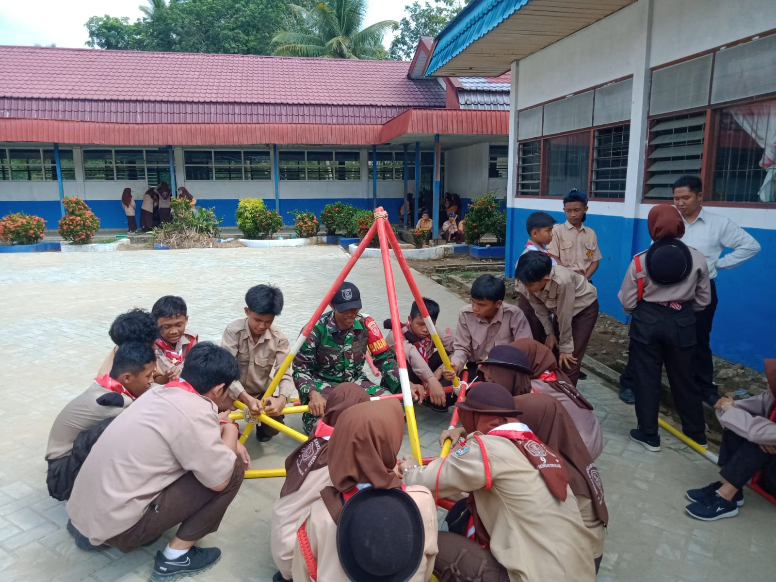 BARABAI-PW:Babinsa Koramil 1002-04/Labuan Amas Selatan Serma Haris Fadillah bersama anggota melaksanakan pembinaan Pramuka di SMPN 9 Pantai Hambawang Barat Kecamatan Labua Amas Selatan Kabupaten Hulu Sungai Tengah. Kamis (16/11/2023)