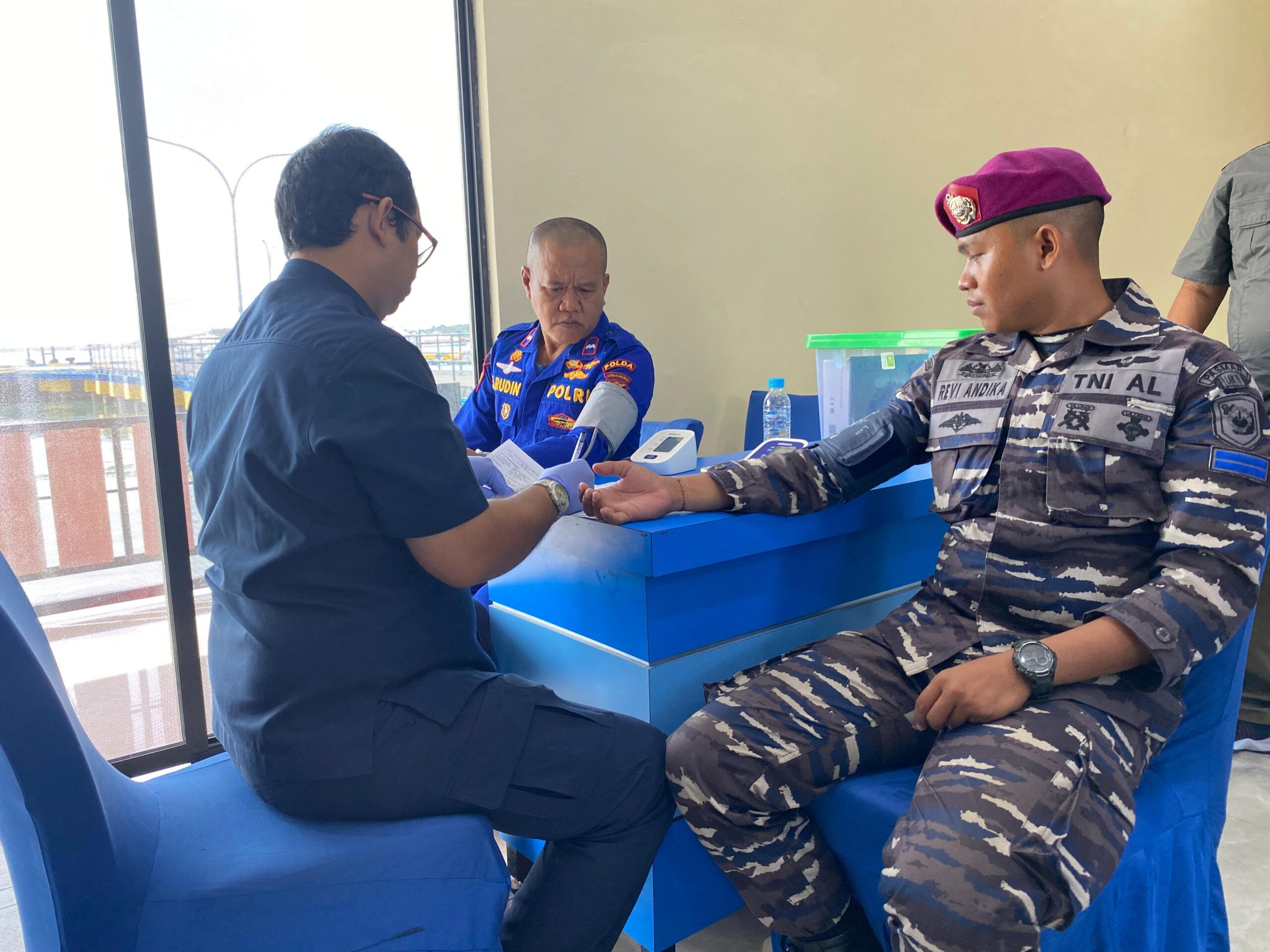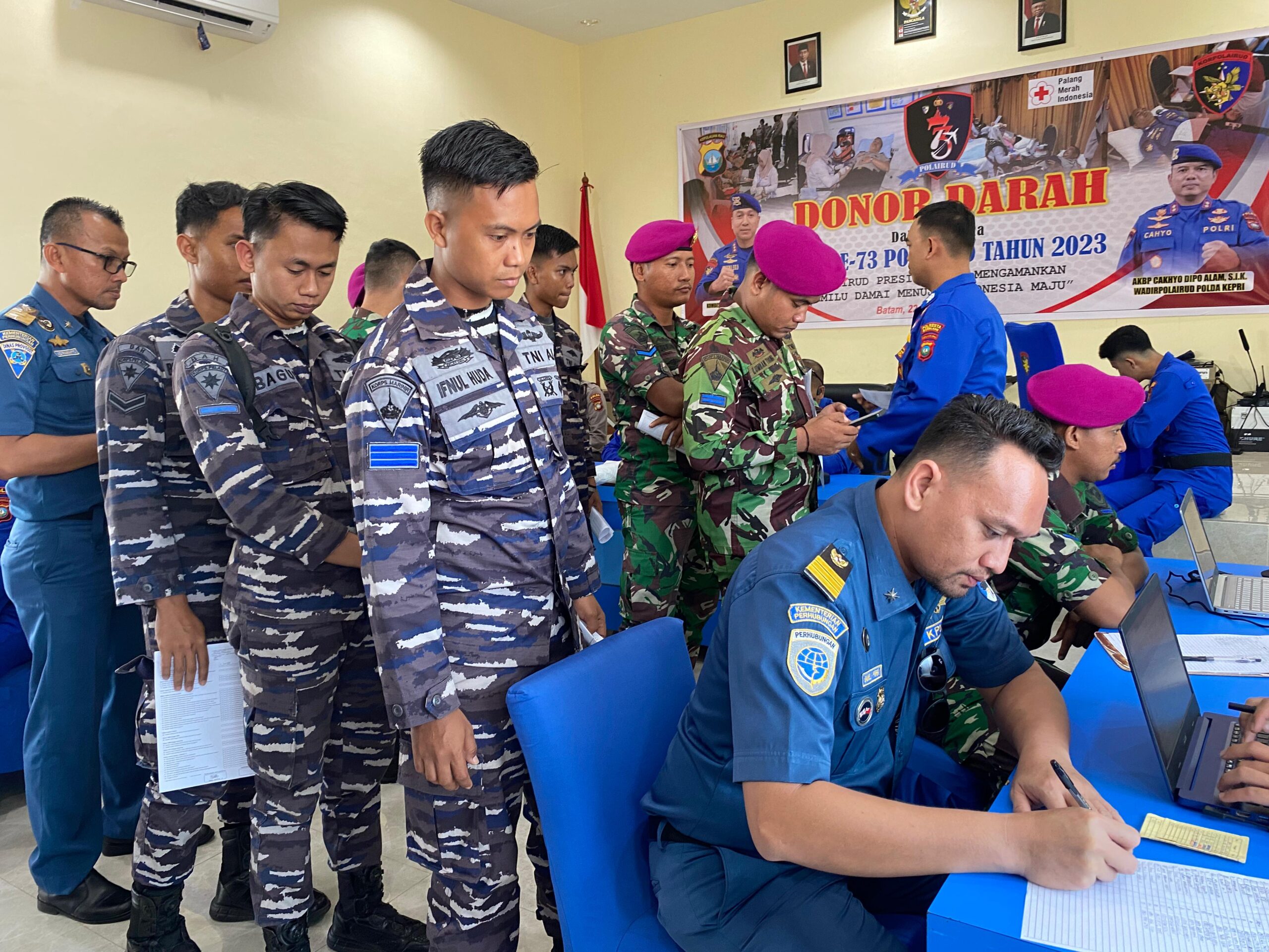Batam, PW: TNI AL, Dispen Kormar (Batam), Pasmar 1. Dengan semangat meningkatkan kepedulian dan solidaritas antar sesama, prajurit Yonmarhanlan IV Batam melaksanakan kegiatan donor darah dalam rangka HUT ke 78 Polairud bertempat di Mako Polairud, Sekupang, Batam, Jumat (17/11/2023).
