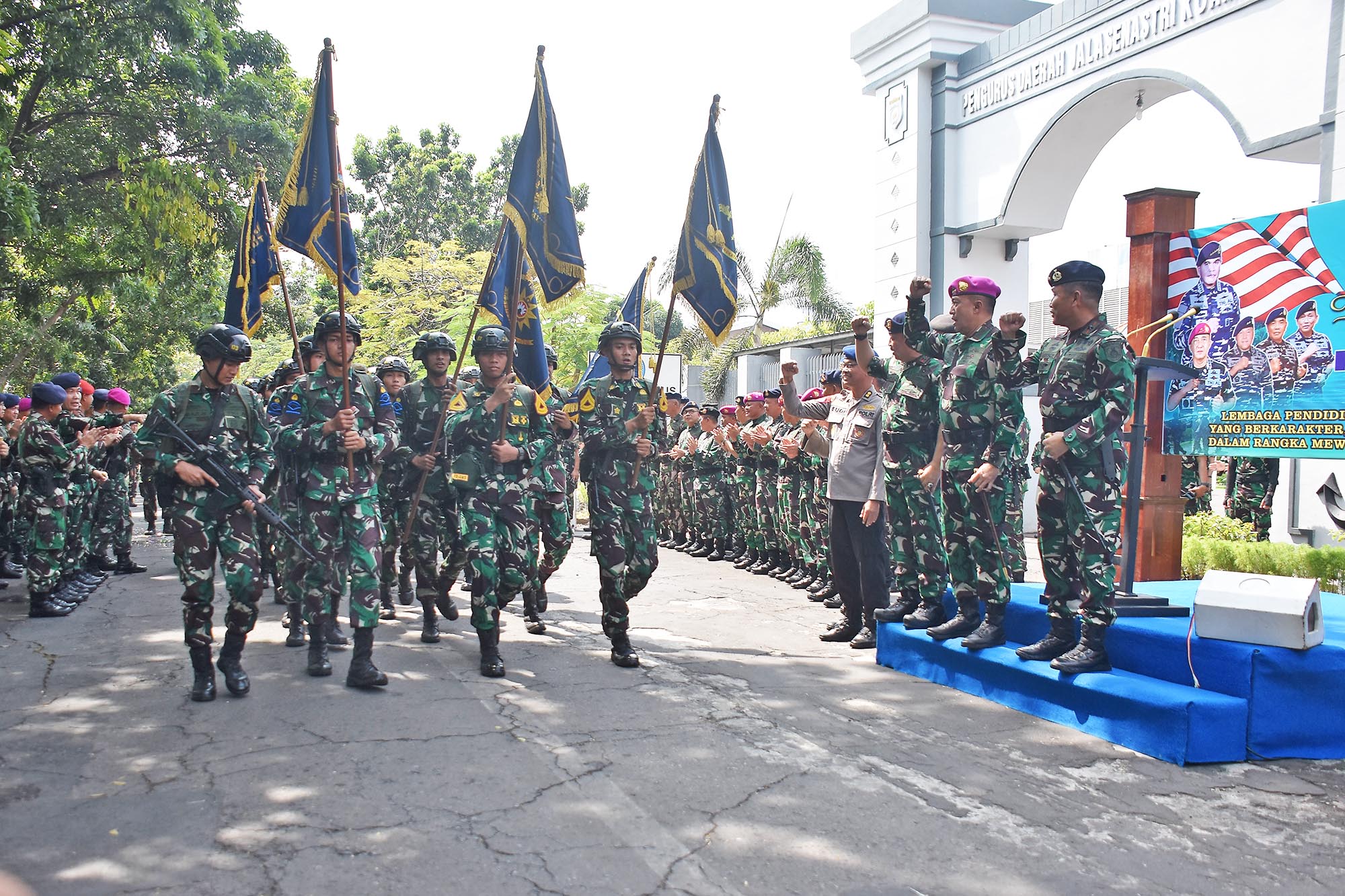 Para peserta Long March Estafet yang mengawali start dari Gedung R4 Denma Koarmada II dan finish di lapangan laut Maluku Kodiklatal menggunakan PDL TNI dengan perlengkapan senjata SS-1, helm tempur, ransel pack, kopel dan veples, bendera TNI AL, bendera pendidikan TNI AL dan bendera 4 lembaga pendidikan TNI AL.