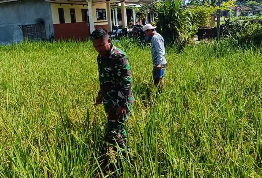 Bersama Anni, petani setempat, Serda Ach Mahfud melakukan pengecekan langsung ke sawah untuk memastikan kondisi tanaman padi. Langkah ini diambil sebagai bagian dari upaya mendukung ketahanan pangan di daerah tersebut.