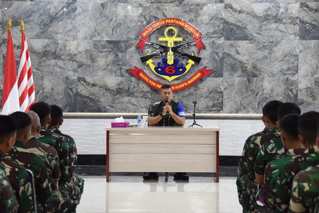 Jakarta, PW: TNI AL, Pasmar 1. Di awal masa jabatannya, Komandan Brigade Infanteri 1 Marinir (Danbrigif 1 Mar) Kolonel Marinir Bambang Dilianto, S.E., M.Tr.Hanla., menggelar tatap muka dan memberikan pengarahan kepada seluruh prajurit Batalyon Infanteri 6 Marinir (Yonif 6 Mar), bertempat di ruang rekreasi Yonif 6 Kesatrian Marinir Hartono Cilandak, Jakarta Selatan, Rabu (21/08/2024).