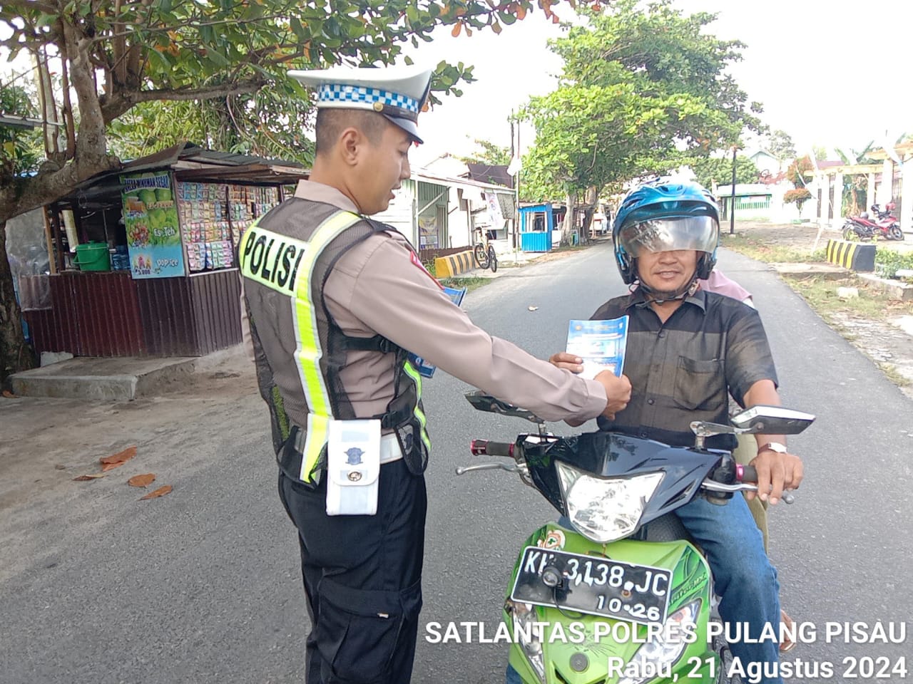 Personel Satlantas Polres Pulang Pisau menyampaikan bahwa pembagian brosur kepada pengendara roda dua bertujuan untuk mengingatkan pengemudi dan penumpang tentang kepatuhan terhadap aturan lalu lintas demi keamanan bersama.