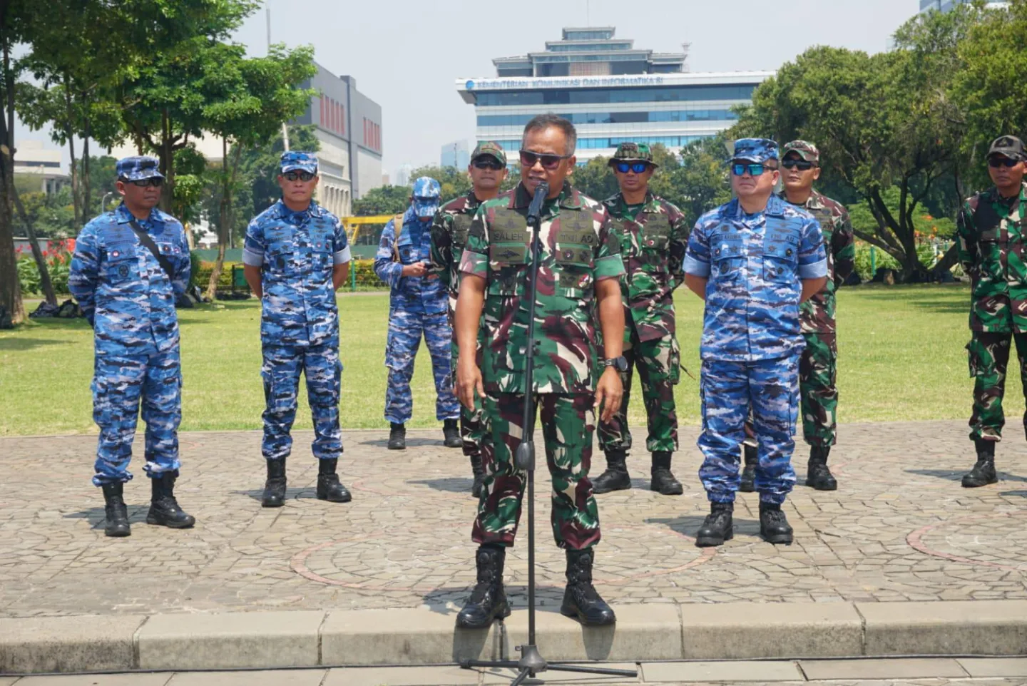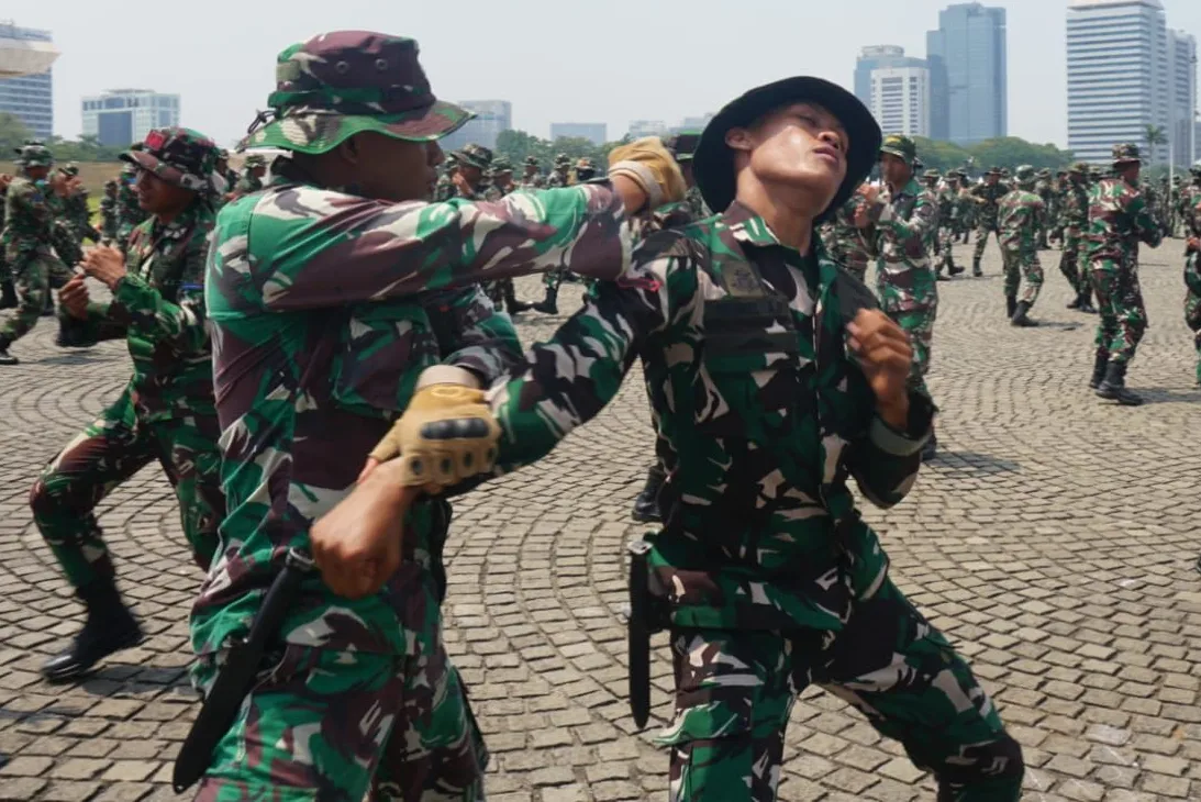 Jakarta, PW: TNI AL, Pasmar 1. Komandan Brigade Infanteri 1 Marinir (Danbrigif 1 Mar) Kolonel Marinir Bambang Dillianto, S.E., M.Tr.Hanla., dampingi Irjen TNI Letnan Jenderal TNI H. Muhammad Saleh Mustafa melihat langsung latihan Bela Diri Taktis (BDT) yang berlokasi di lapangan silang Monas, Jakarta Pusat, Selasa (17/09/2024).