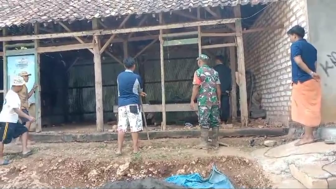 PAMEKASAN PW – Anggota Koramil 0826-07 Pegantenan, Serka I Gede Tama, bersama warga Desa Palesanggar bergotong royong membantu perehapan rumah milik Sulkan (56), warga Dusun Timur, Desa Palesanggar, Kecamatan Pegantenan, Minggu (08/12/2024).
