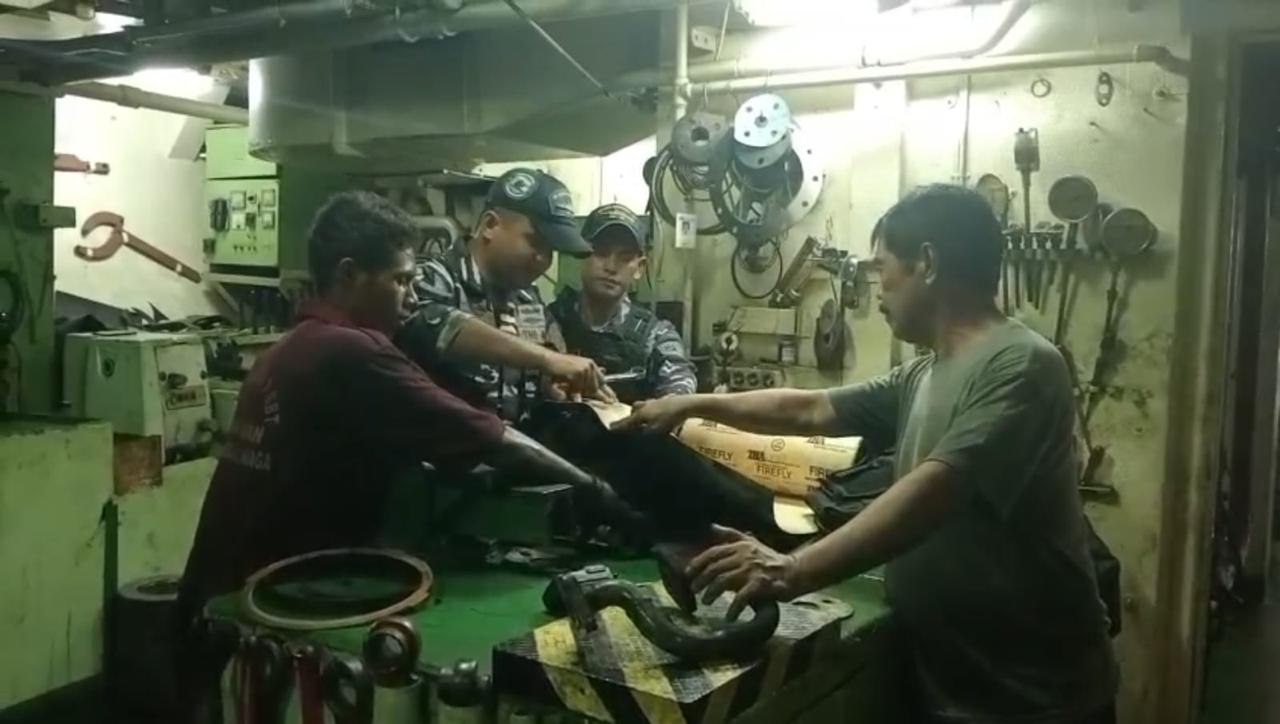 Dengan sigap, tim dari KRI Matabongsang-873 bersama awak kapal MV Serenity-09 melakukan perbaikan dengan mengganti seal/oring serta memasang kembali klep pendingin air tawar.