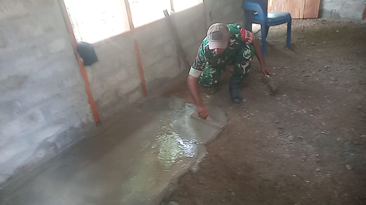 SBB PW Sebagai bentuk kepedulian terhadap masyarakat, Bintara Pembina Desa (Babinsa) Koramil 1513-01/Piru, Sertu Hosea Matital, turut serta membantu warga binaannya, Bapak Cena Pariela, dalam proses pengecoran lantai dasar rumahnya di Desa Lumoli, Kecamatan Seram Barat, Kamis (3/4).