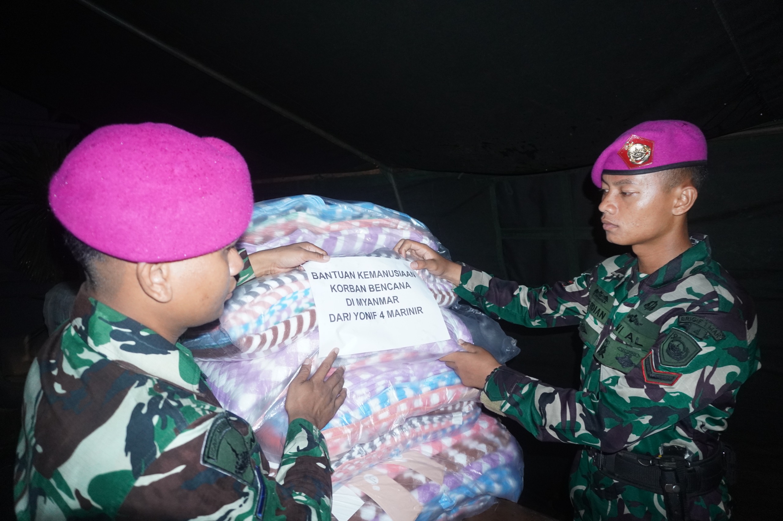 TNI AL, Dispen Kormar, Pasmar 1 (Jakarta). Prajurit Batalyon Infanteri 4 Marinir (Yonif 4 Mar) ikut serta menyerahkan bantuan kemanusiaan korban bencana alam di Myanmar bertempat di Balai Prajurit Lanmar Jakarta Kesatrian Marinir Hartono Cilandak, Jakarta Selatan, Rabu (02/04/2025).