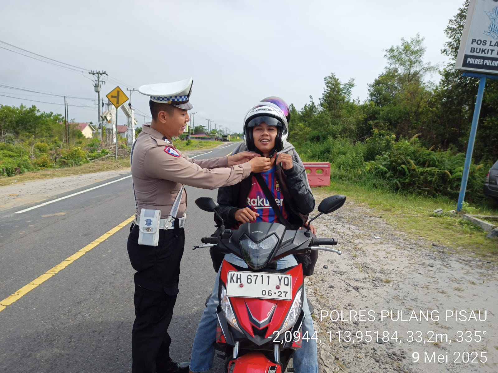Polres Pulang Pisau – Satuan Lalu Lintas – Dengan Senyuman yang ramah Personel Satlantas Polres Pulang Pisau mengingatkan pengendara roda dua agar selalu klik helm saat berkendara. Jumat (9/5/2025).