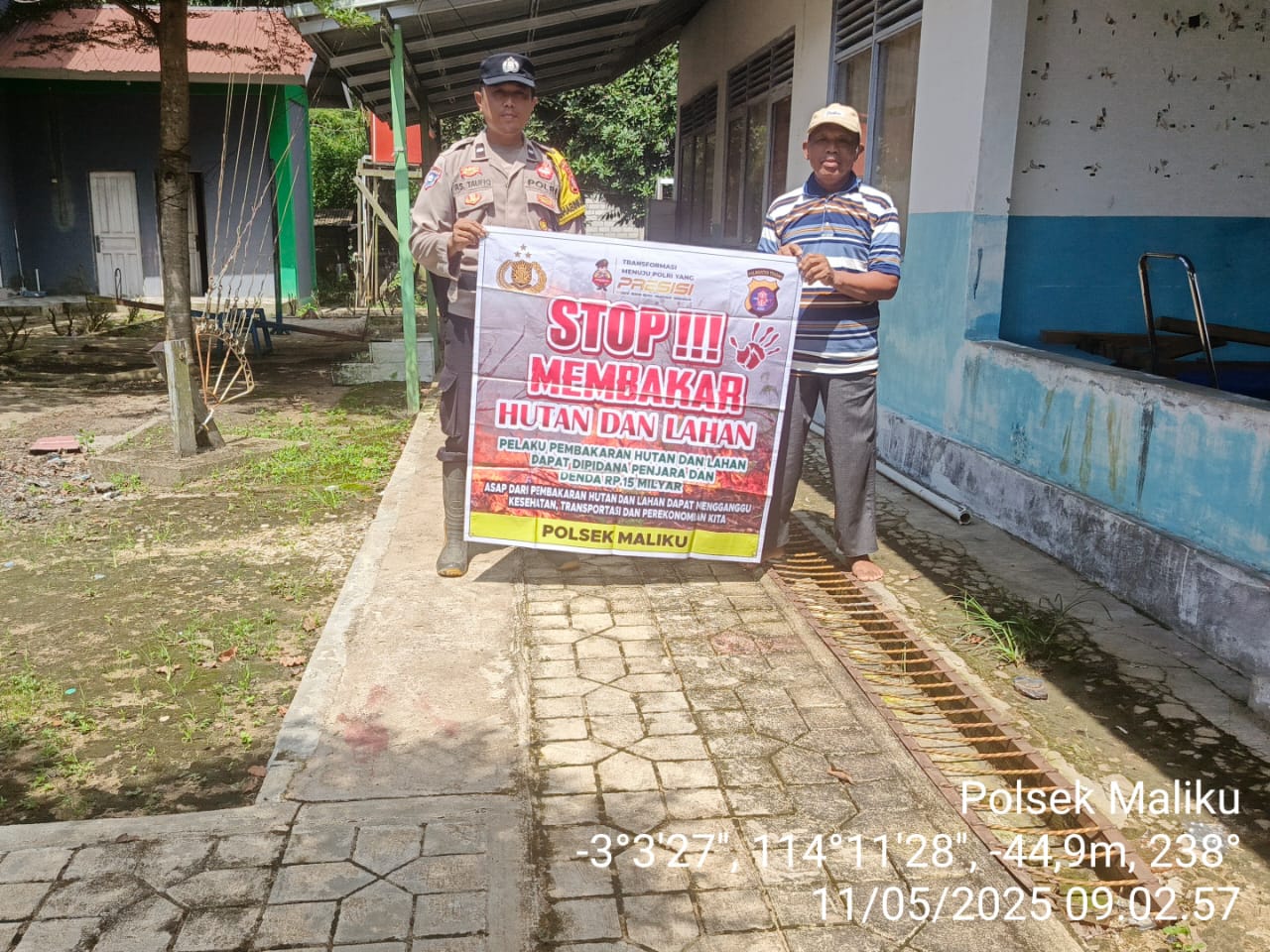 Polres Pulang Pisau – Personel Bhabinkamtibmas Desa Tahai Baru, Polsek Maliku, Polres Pulang Pisau, Polda Kalteng, Aipda Taufiq A.S., menyambangi warga masyarakat untuk sampaikan Sosialisasi Larangan Membakar Hutan dan Lahan, Minggu (11/05/2025) Pagi