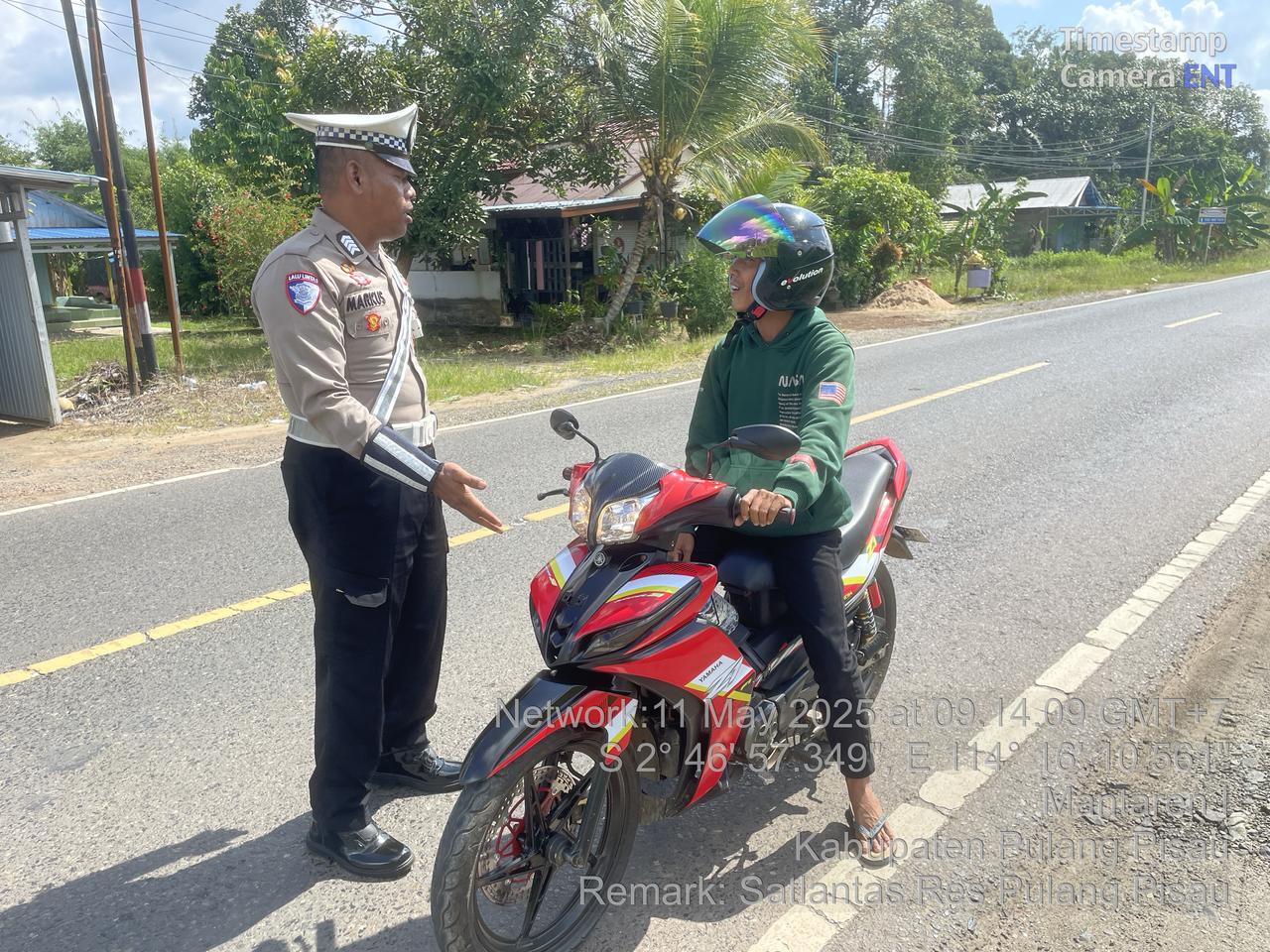 Polres Pulang Pisau – Satuan Lalu Lintas – Personel Satlantas Polres Pulang Pisau memberikan teguran simpatik saat mendapati pengendara motor yang melanggar peraturan berlalu lintas dengan tidak memasang plat nomor motor atau TNKB (Tanda Nomor Kendaraan Bermotor), Minggu (11/5/2025). Pukul 10.00 WIB