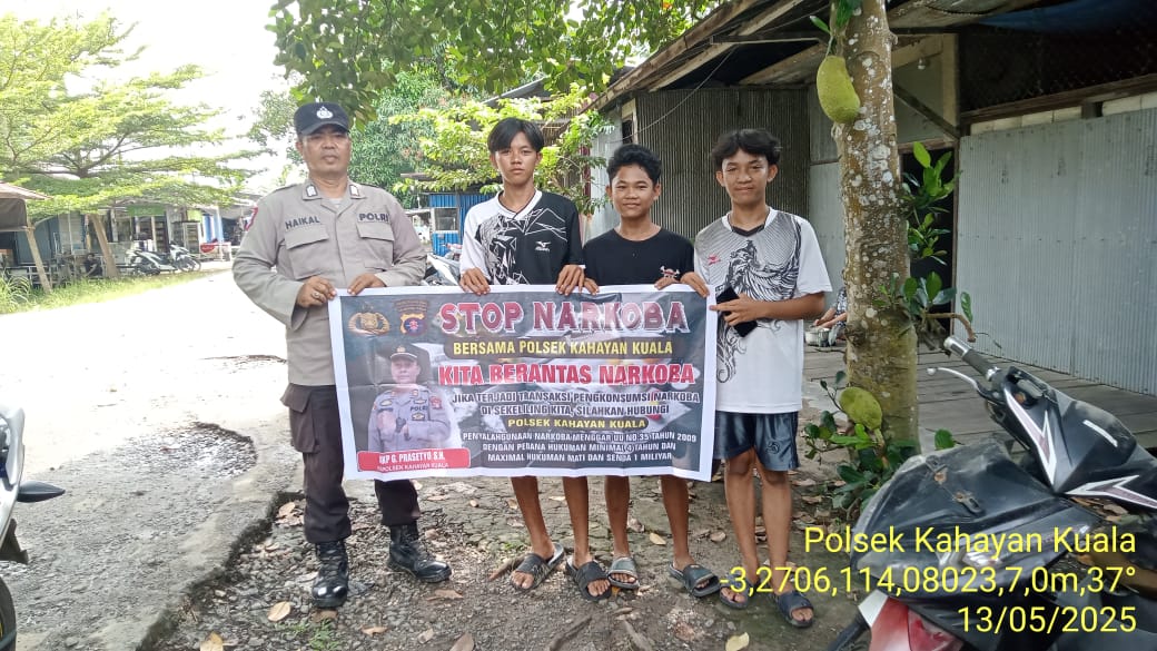 Polres Pulang Pisau – Polsek Kahayan kuala, Polres Pulang Pisau, Polda Kalteng, Pers Bhabinkamtibmas melaksanakan giat himbauan larangan dan stop narkoba di wilayah kecamatan Kahayan kuala Kabupaten Pulang Pisau Provinsi Kalimantan Tengah, Selasa (13/05/2025).