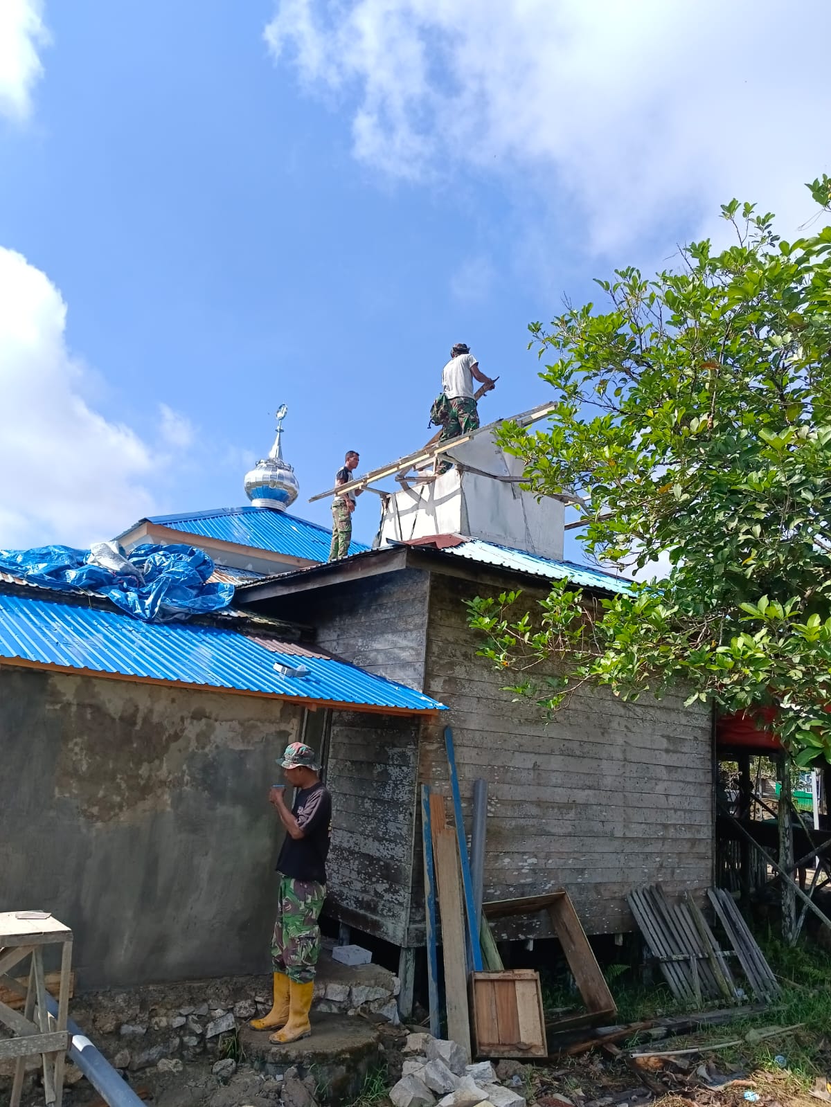 Berdasarkan pantauan di lapangan pada Sabtu (17/5/2025), anggota Satgas TMMD ke-124 Kodim 1002/HST tengah fokus pada pemasangan atap dan kubah langgar Darussalam.