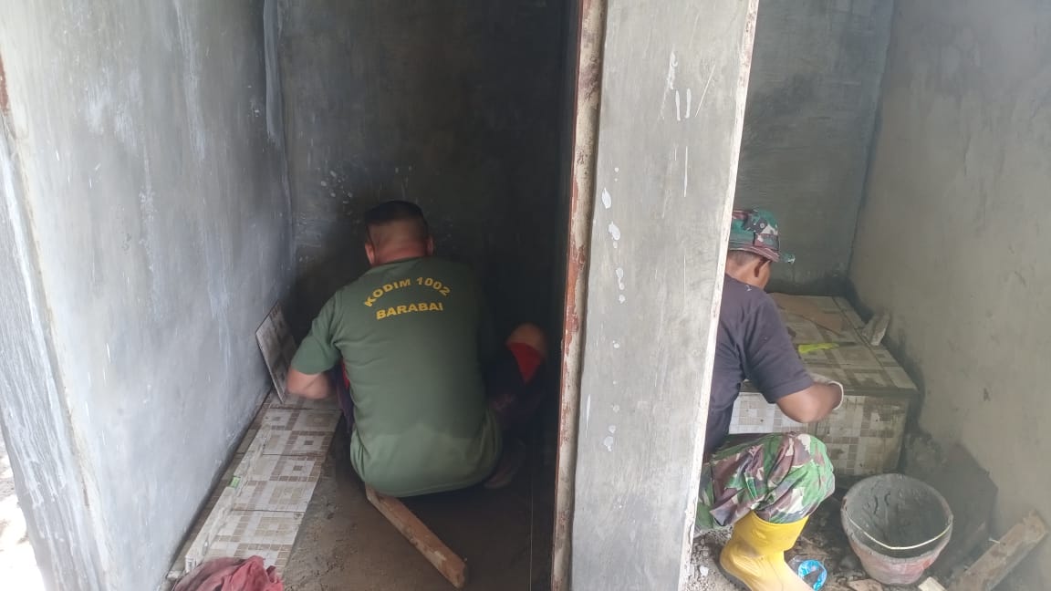 Pantauan di lapangan pada Sabtu (17/5/2025) menunjukkan anggota Satgas TMMD ke-124 Kodim 1002/HST sedang fokus pada pemasangan closet dan pengacian dinding MCK yang baru dibangun.