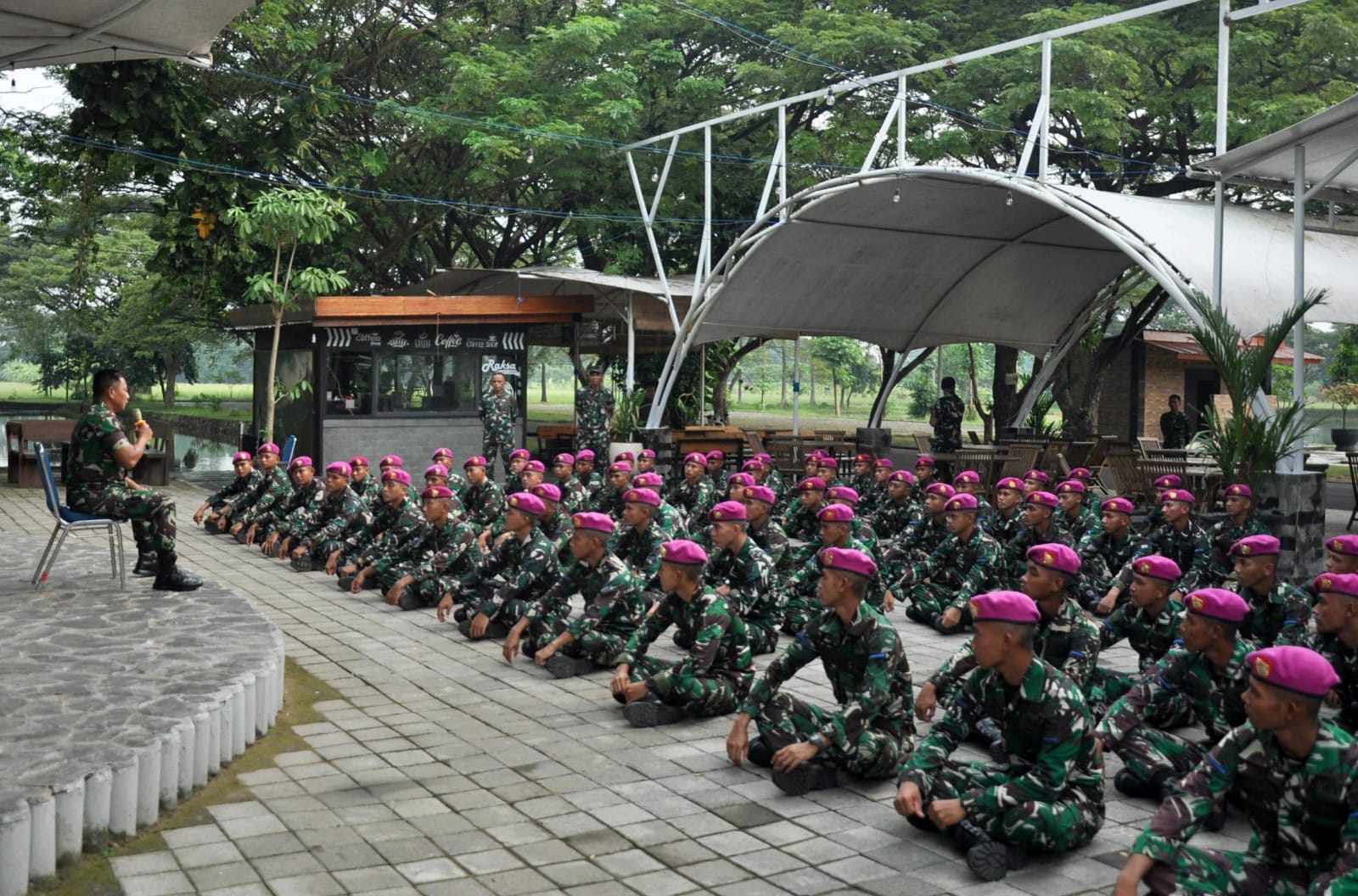 Dispen Kormar TNI AL (Sidoarjo) PW : Wakil Komandan Pasmar 2, Kolonel Marinir Arief Rahman H Anggorojati, S.E., CTMP., M.M., memberikan pengarahan kepada para prajurit Bintara Remaja dan Tamtama Remaja Angkatan 44 gelombang 1 di Raksa Cafe, Kesatrian Marinir Moekijat, Mako Pasmar 2, Gedangan, Sidoarjo, Selasa (27/05/2025).