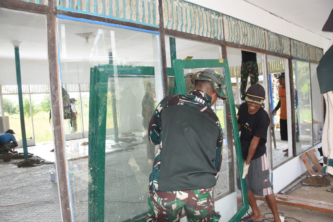 Terlihat anggota Satuan Tugas (Satgas) TMMD tengah fokus pada pekerjaan rehabilitasi Langgar Darussalam. Mereka tampak sedang memasang Jendela. Rabu (28/5).