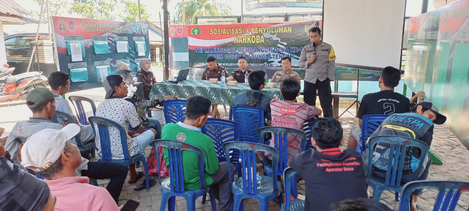 HARUYAN, HST- PW: Sebagai upaya pencegahan dan pemberantasan penyalahgunaan narkoba, Satuan Tugas (Satgas) Tentara Manunggal Membangun Desa (TMMD) ke-124 Kodim 1002/Hulu Sungai Tengah (HST) berkolaborasi dengan Kepolisian Resor (Polres) HST menggelar kegiatan sosialisasi dan penyuluhan tentang bahaya narkoba.