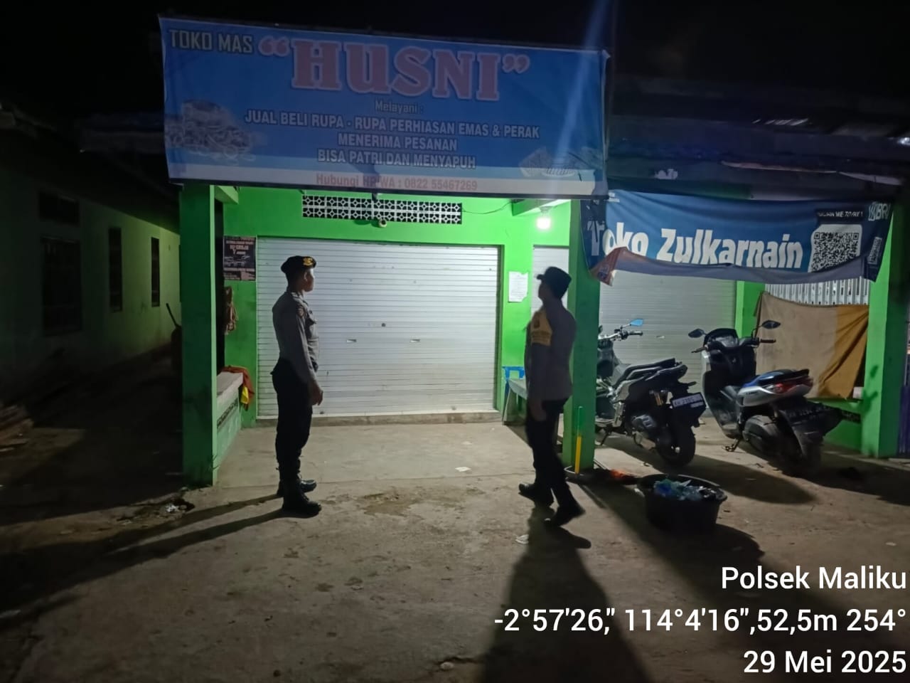 Personel melaksanakan Patroli Malam dengan sasaran lingkungan obyek vital dan pertokoan diwilayah hukum Polsek Maliku, dalam kegiatan patroli petugas memastikan tidak terdapat potensi gangguan kamtibmas serta mengecek kondisi kamera Cctv yang terpasang