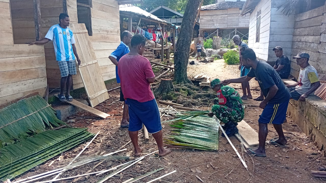 Sertu Hosea terlihat bersama Ibu Dina Awear, salah satu warga setempat, membuat atap rumah tradisional dari daun Nipa.