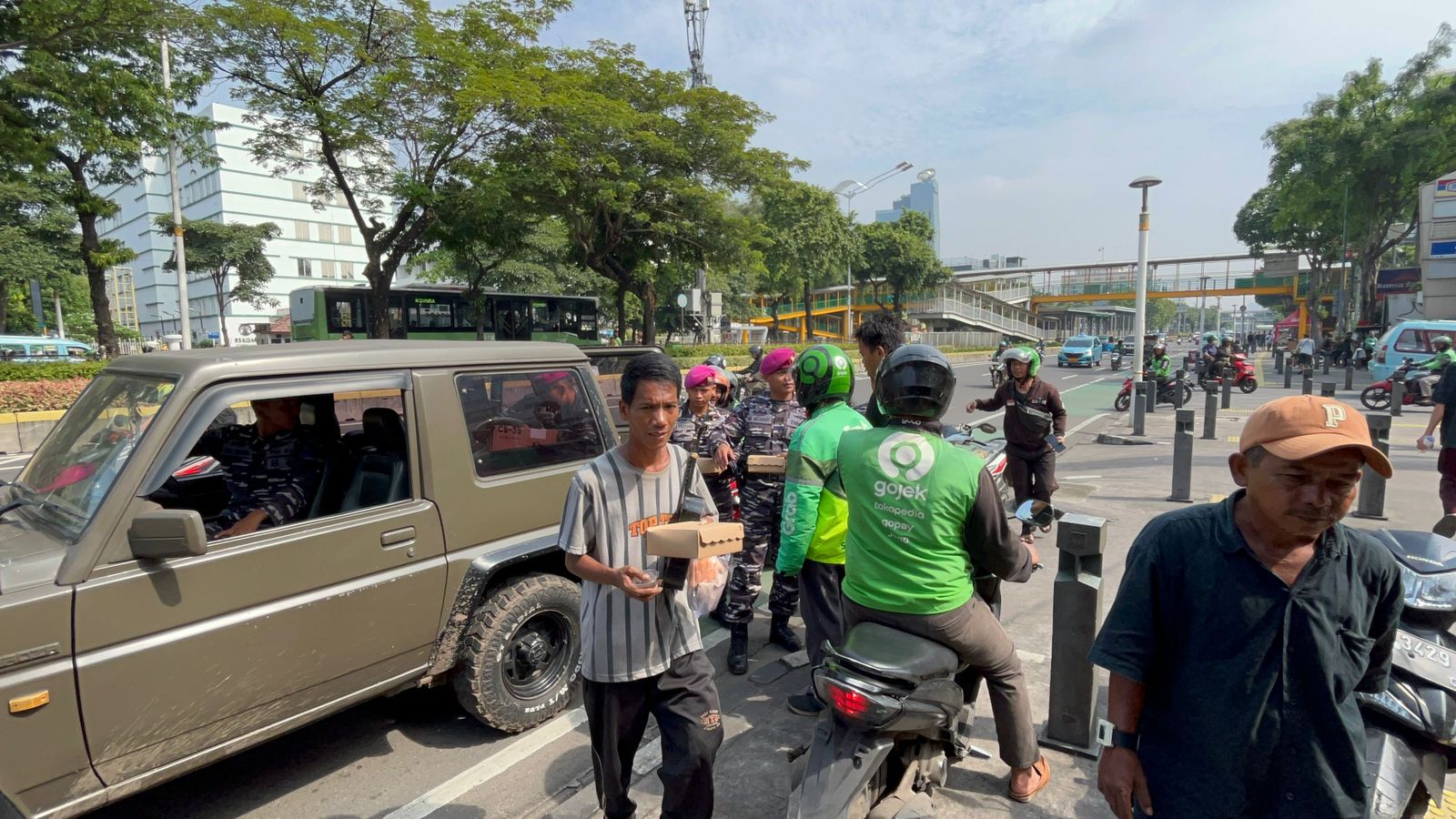 TNI AL, Pasmar 1. Semangat berbagi di bulan Dzulhijjah menyemarakkan wilayah kerja Batalyon Marinir Pertahanan Pangkalan (Yonmarhanlan) III Jakarta, saat para prajurit Hiu Perkasa turun langsung ke lapangan untuk membagikan makan siang gratis kepada para pengemudi ojek online yang tengah berjuang di jalanan Ibu Kota, Jakarta, Sabtu (31/05/2025).