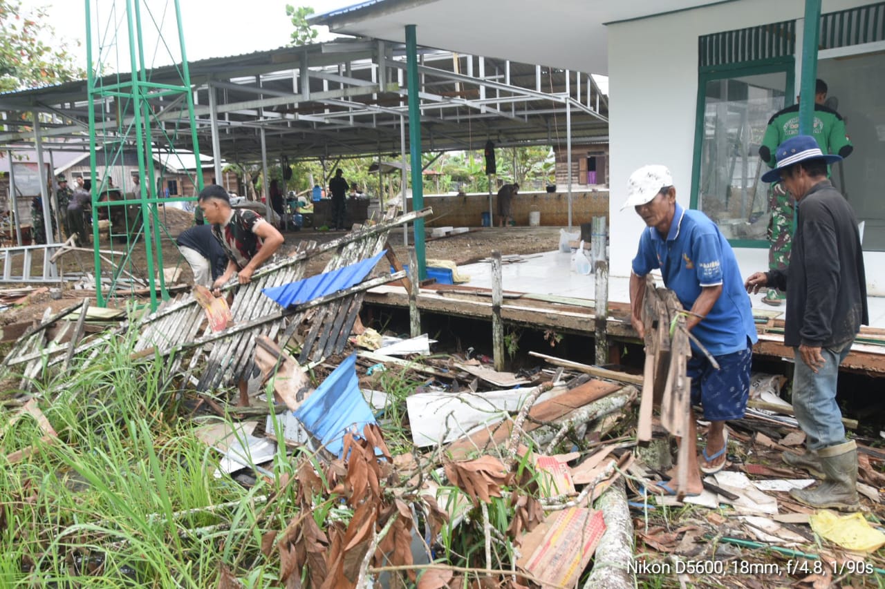 Haruyan, Hulu Sungai Tengah – PW: Semangat gotong royong terlihat jelas di sekitar lokasi rehabilitasi rumah ibadah Langgar Darussalam di Desa Pengambau Hilir Luar.