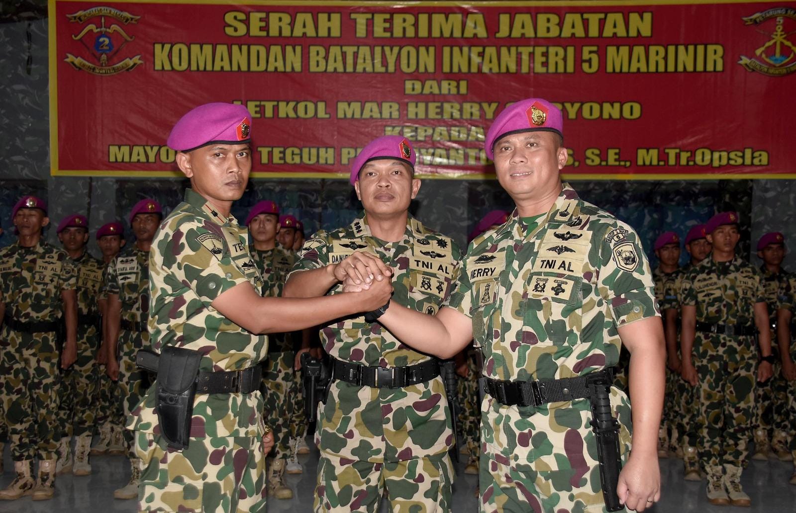 TNI AL, Dispen Kormar (Surabaya) PW : Komandan Brigif 2 Marinir Kolonel Marinir Daniel Tarigan memimpin Serah Terima Jabatan (Sertijab) Komandan Batalyon Infanteri 5 Marinir di Gedung Balai Prajurit Kesatrian Marinir Soeroto II, Ujung, Semampir, Surabaya, Jawa Timur. Senin (30/06/2025). Jabatan Komandan Batalyon Infanteri 5 Marinir diserahterimakan dari pejabat lama Letkol Marinir Herry Suryono kepada Mayor Marinir Teguh Pristiyanto Dwi S., S.E., M.Tr.Opsla. yang sebelumnya menjabat sebagai Perwira Staf Logistik (Paslog) Brigif 1 Marinir sedangkan Letkol Marinir Herry Suryono akan menempati jabatan baru sebagai Perwira Staf Operasi (Pasops) Brigif 2…
