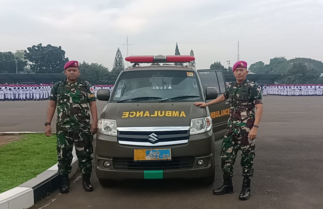 TNI AL, Pasmar 1. Prajurit Batalyon Kesehatan 1 Marinir (Yonkes 1 Marinir) melaksanakan Pendukungan Kesehatan (Dukkes) pada saat upacara peringatan Hari Lahir Pancasila yang diselenggarakan di Lapangan Apel Brigif 1 Kesatrian Marinir Hartono Cilandak, Jakarta Selatan, Senin (02/06/2025).