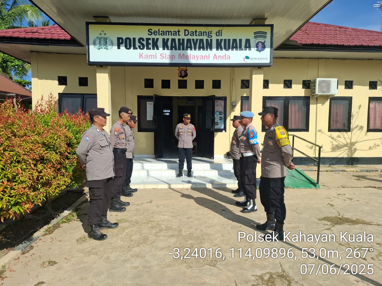 Polsek Kahayan kuala Polres Pulang Pisau Polda Kalteng melaksanakan Kegiatan serah terima piket penjagaan mako polsek Kahayan kuala di halaman Mako polsek Kahayan kuala.