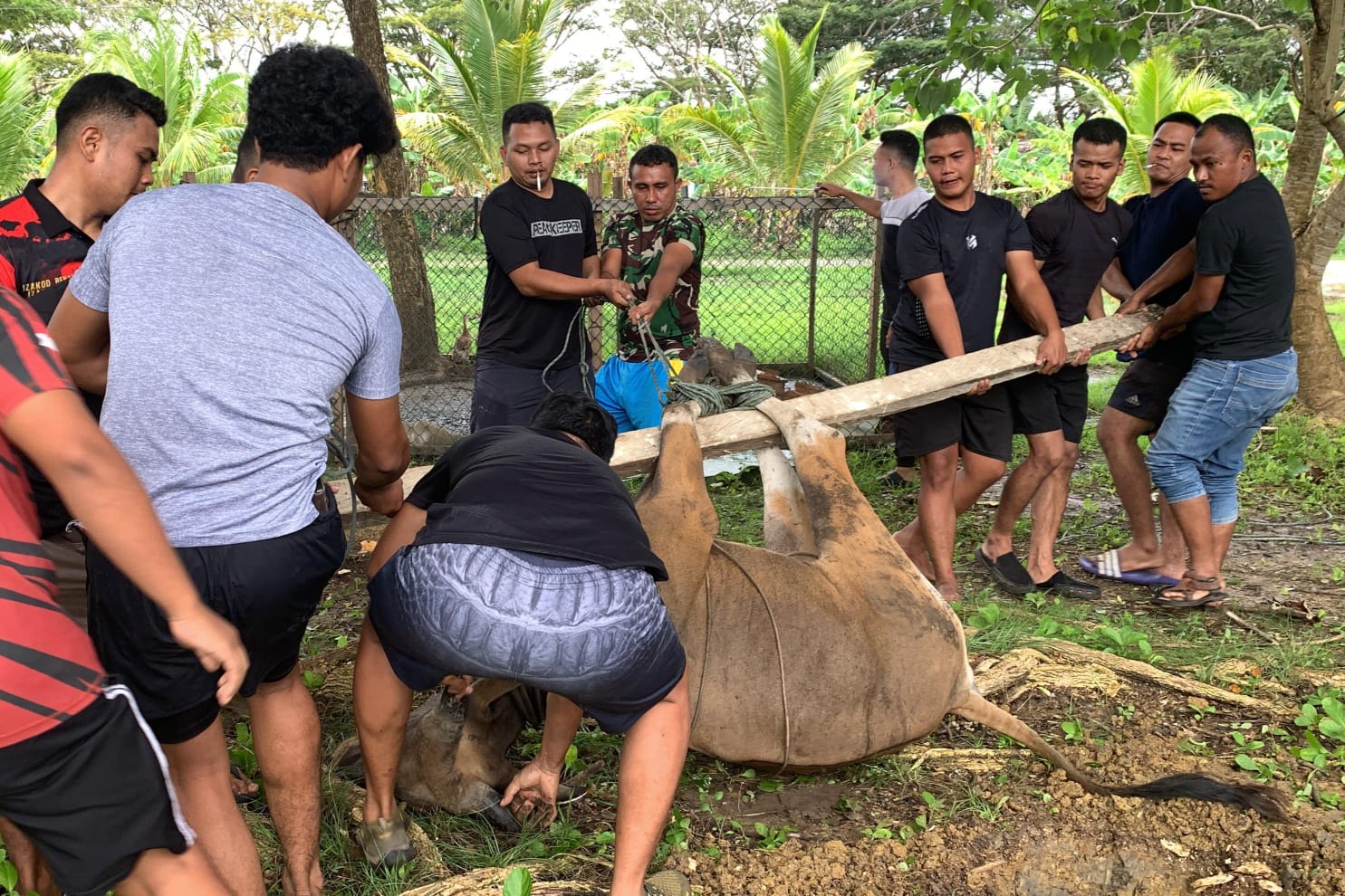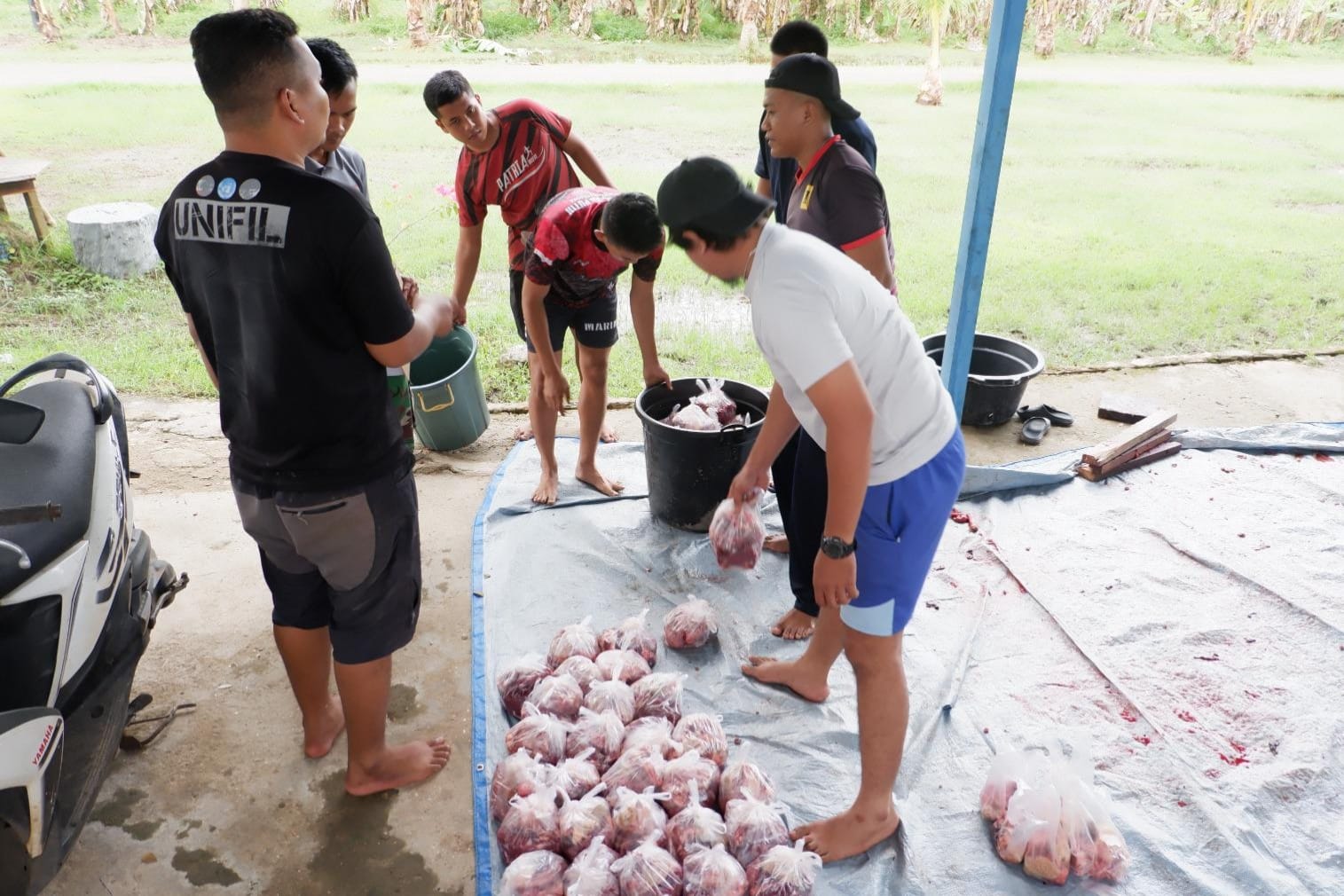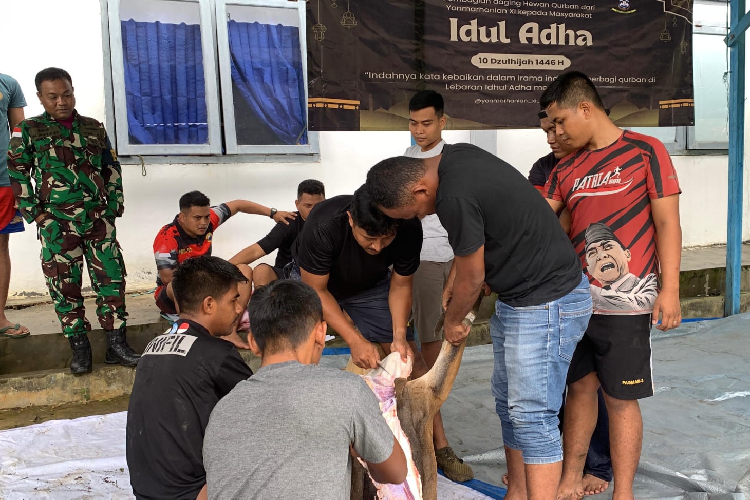 TNI AL, Dispen Korps Marinir (Merauke) PW : Dalam rangka perayaan Hari Raya Idhul Adha 1446 H / 2025 M, Komandan Yonmarhanlan XI Merauke Letkol Marinir Deni Kusmana memimpin kegiatan penyembelihan hewan kurban dan pembagian daging kurban kepada masyarakat, bertempat di Mako Yonmarhanlan XI, Jl. Diko 1 Trans Irian Wasur, Rimba Jaya, Kab. Merauke, Papua Selatan. Jumat (06/06/2025).