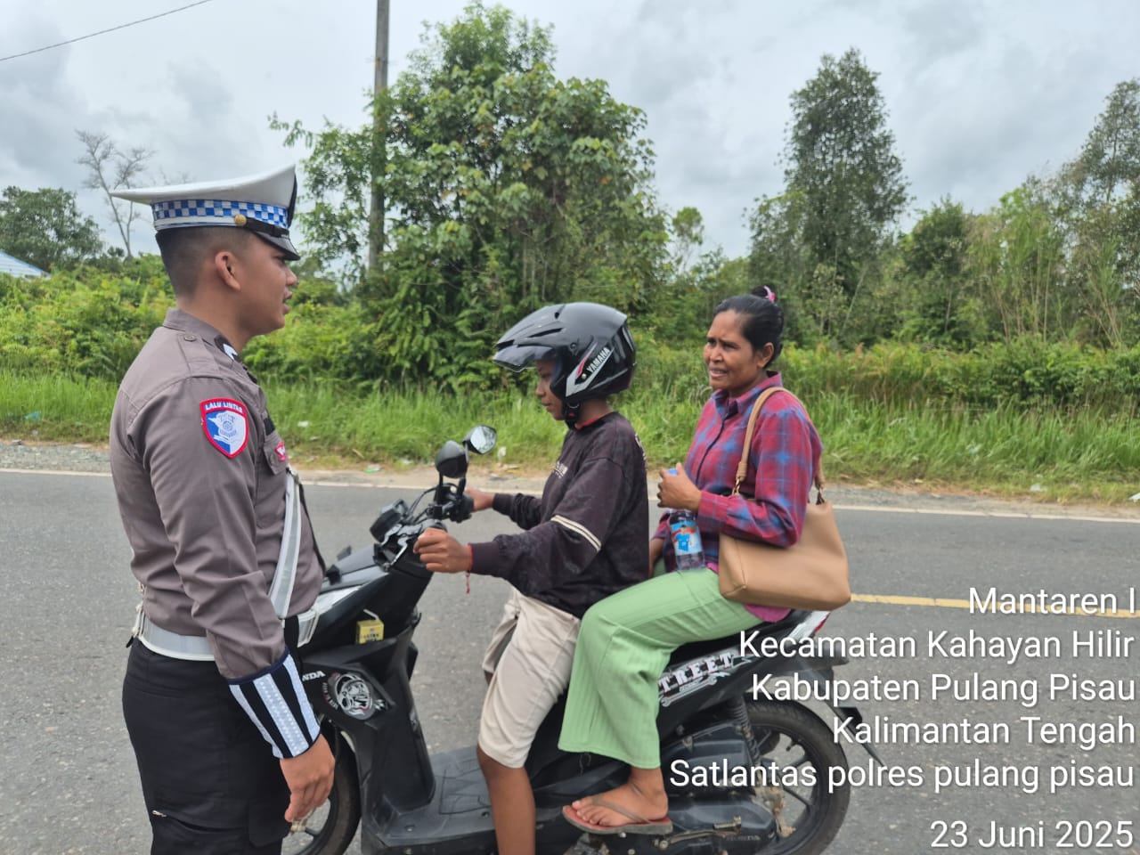 Polres Pulang Pisau – Satuan Lalu Lintas – Satlantas Polres Pulang Pisau memberikan pembinaan/ teguran simpatik kepada pengendara sepeda motor yang tidak menggunakan helm,