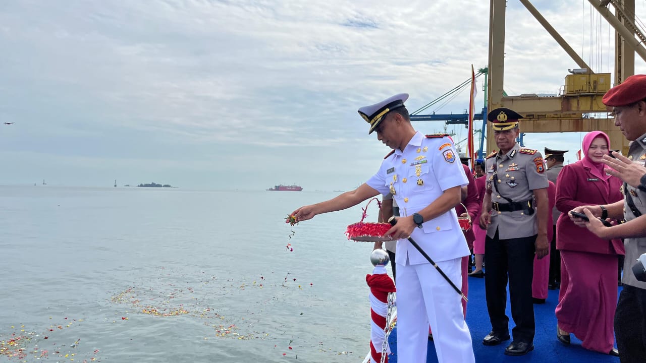Dalam Memperingati Hari Bhayangkara ke -79 tahun 2025, Komandan Lantamal VI (Danlantamal VI) Brigjen TNI (Mar) Dr. Wahyudi, S.E., M.Tr.Hanla., M.M., M.Han dalam hal ini yang diwakilkan oleh Komandan Satuan Kapal Patroli (Dansatrol) Lantamal VI Kolonel Laut (P) Agus Tri Arianto S.T., M.Tr.Opsla mengikuti tabur bunga dengan tema “Polri Untuk Masyarakat” bertempat di Dermaga Peti Kemas Soekarno Hatta Selatan Makassar. Senin (23/06/2025).