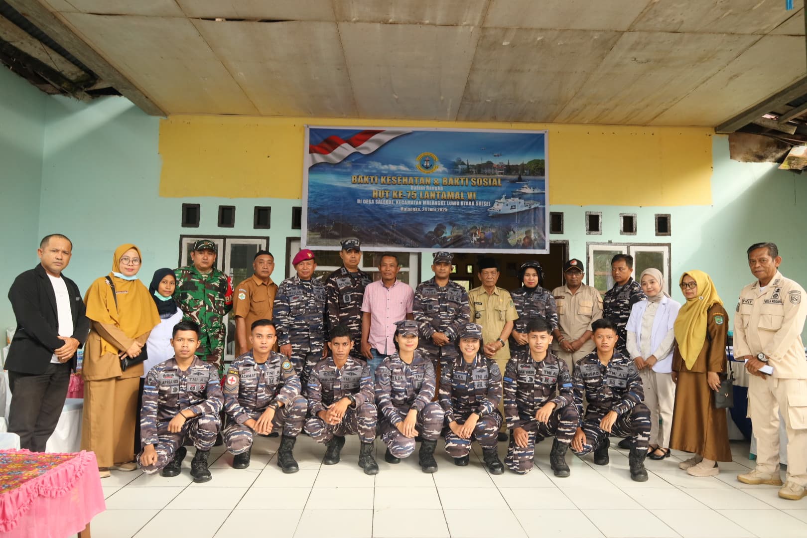 Luwu Utara, Dalam rangka menyambut Hari Ulang Tahun (HUT) ke-75 pada tanggal 01 Juli 2025 mendatang, Pangkalan Utama TNI AL VI (Lantamal VI) Makassar menggelar kegiatan Bakti Sosial (Baksos) dan Bakti Kesehatan (Bakkes) di Desa Salekoe,Kecamatan Malangke, Kabupaten Luwu Utara, Provinsi Sulawesi Selatan (Sulsel) , Selasa (24/06/2025).