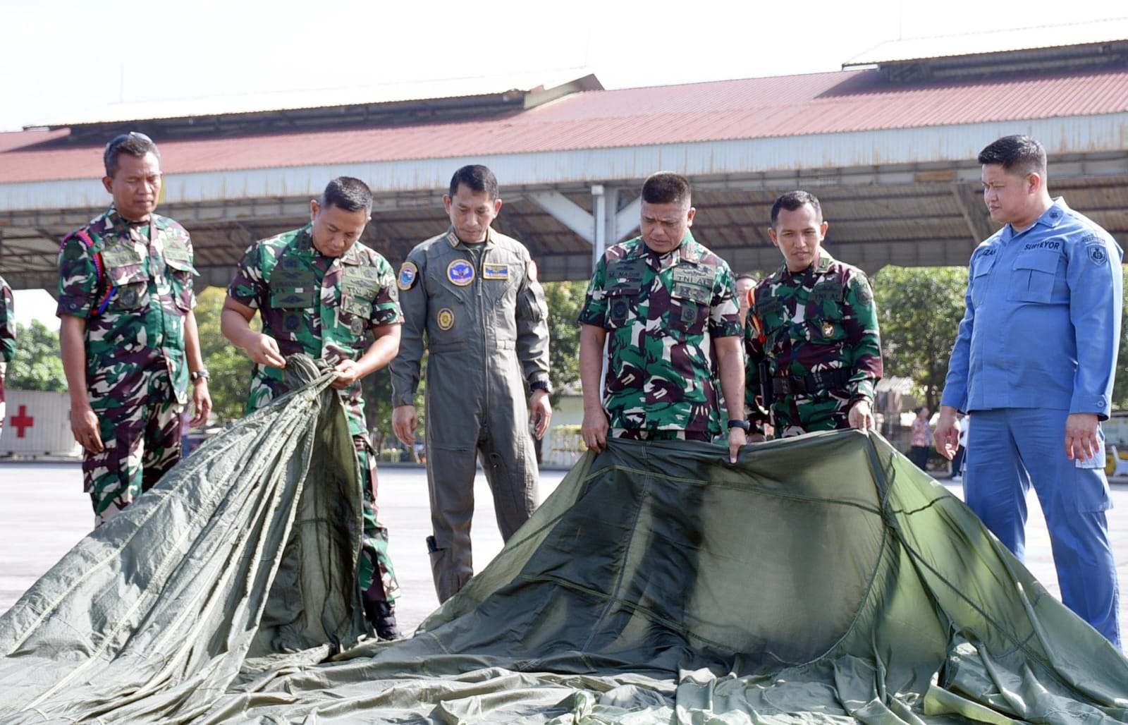Dispen Kormar, TNI AL (Sidoarjo) PW : Wadan Pasmar 2 Kolonel Marinir Arief R.H. Anggorojati, S.E., CTMP., M.M., mendampingi Wadan Kormar Brigjen TNI (Mar) Muhammad Nadir, M.Tr.Opsla., meninjau Uji Fungsi Parasut Statik di Hanggar Skuadron Udara 400 Lanudal Juanda, Sidoarjo. Kamis (26/06/2025).