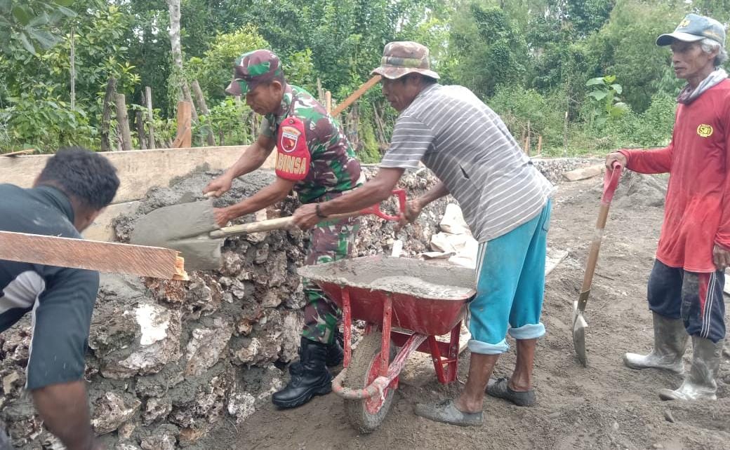Dalam kegiatan tersebut, Koptu La Basri bersama warga sekitar bergotong royong membantu Bapak La Haris dalam pembuatan pondasi rumah.