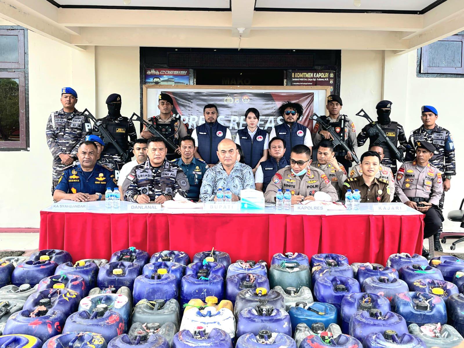 Komandan Lanal Aru Letkol Laut (P) Sriadi, S.E., M.Tr. Opsla. bersama Kapolres Kepulauan Aru AKBP Albert Perwira Sihite, S.H., S.I.K., M.H memimpin konferensi pers pemusnahan miras ilegal yang merupakan hasil operasi gabungan sinergisitas antara Polres Kepulauan Aru, Lanal Aru, dan Unit Penyelenggara Pelabuhan (UPP) Kelas III Dobo.