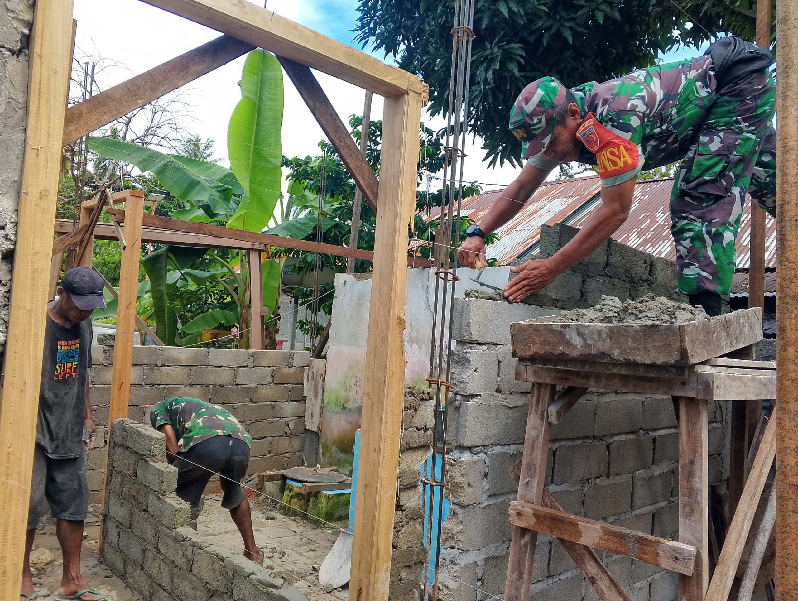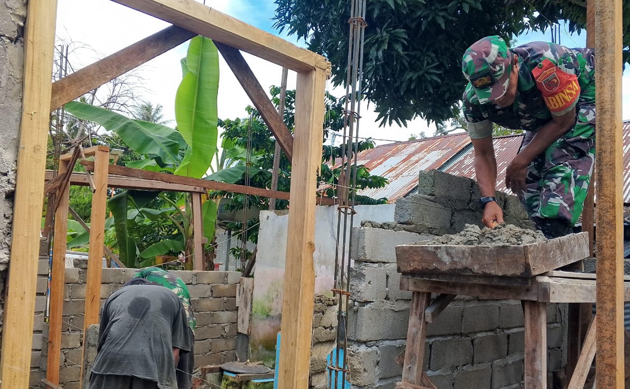 Dalam kerja bakti tersebut, Sertu La Kadir bersama warga bahu-membahu mengangkut material bangunan dan membantu proses pembangunan pondasi rumah.