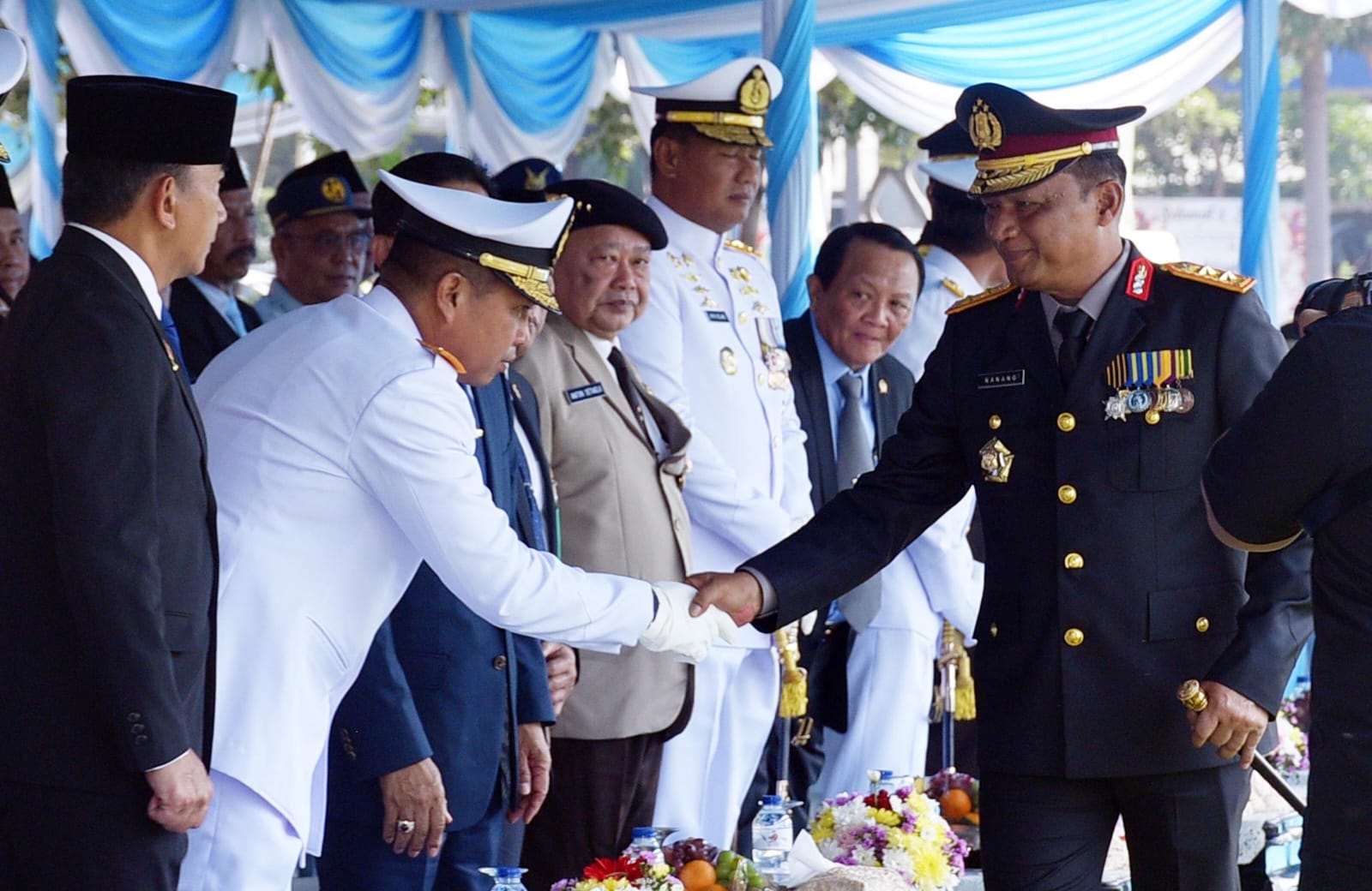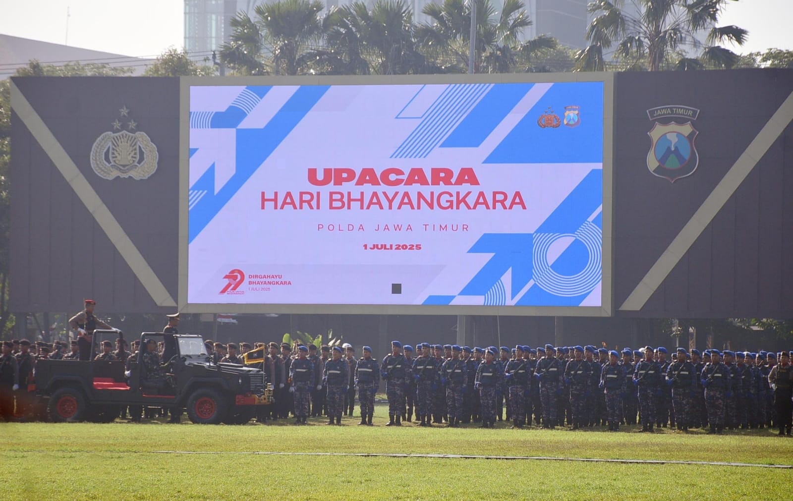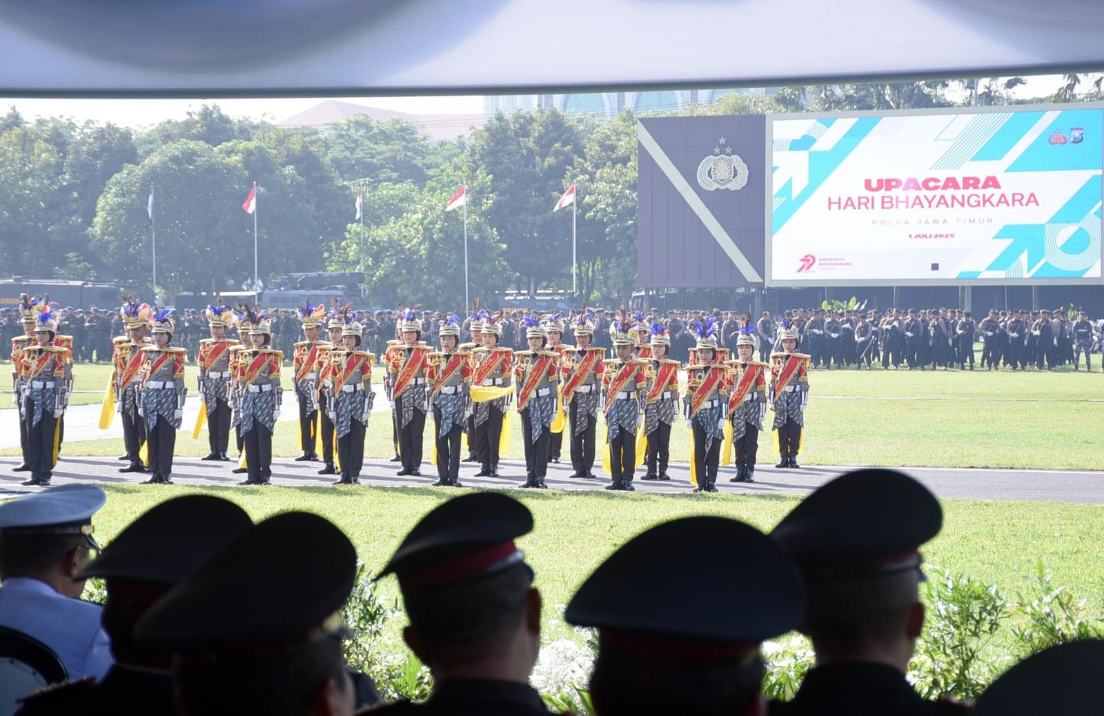 Upacara peringatan Hari Bhayangkara Ke-79 yang mengangkat tema “Polri Untuk Masyarakat” dipimpin Kapolda Jawa Timur Irjen Pol. Drs. Nanang Avianto, M.Si., dihadiri Gubernur Jawa Timur Dra. Hj. Khofifah Indar Parawansa, M.Si., Pangdam V/Brawijaya Mayjen TNI Rudy Saladin, M.A., Forkopimda Jawa Timur, pejabat utama Polda Jatim, pejabat TNI Jawa Timur, serta tokoh agama dan tokoh mayarakat.