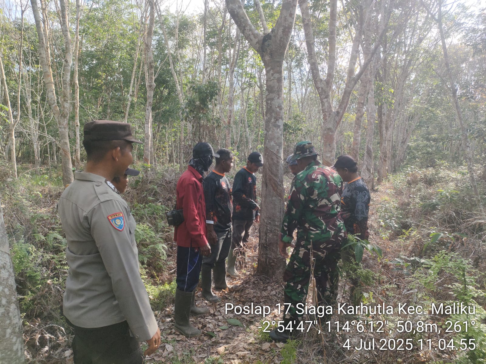 Personel Poslap 17 menyambangi warga masyarakat yang sedang beraktivitas di lahan perkebunan, petugas menyampaikan himbauan kepada warga masyarakat perihal larangan membakar hutan dan lahan serta Sanksi Pidana Terhadap pelaku yang membakar hutan dan lahan