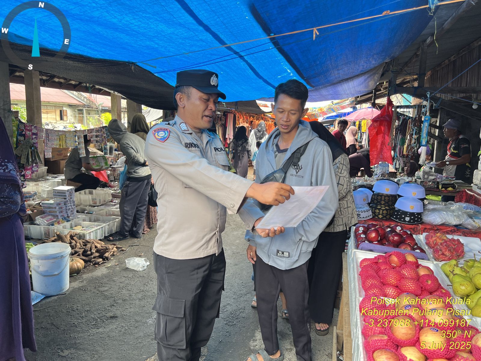 Polres Pulang Pisau – Personil Polsek Kahayan Kuala Polres Pulang Pisau, Polda Kalteng, sosialisasi tentang Maklumat Kapolda Kateng terkait mengemukakan pendapat di muka umum di larang membawa, menggunakan senjata tajam & barang yang berbahaya seperti bahan peledak, Sabtu (05/07/2025)- Jam 10.00 Wib.