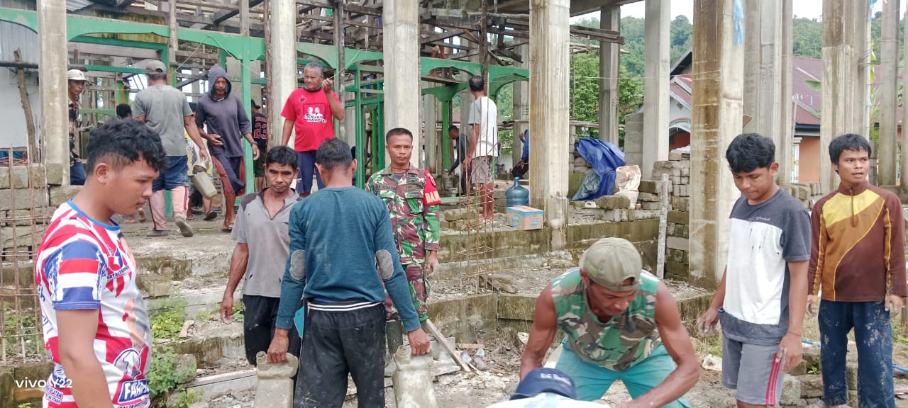 SBB PW Dalam semangat kebersamaan dan gotong royong, Anggota Koramil 1513-01/Piru bersama masyarakat Dusun Waeyoho, Desa Kawa, Kecamatan Seram Barat, kab SBB melaksanakan kerja bakti lanjutan pengecoran slot pembangunan Masjid Al Muhajirin, Jumat (11/07/2025).