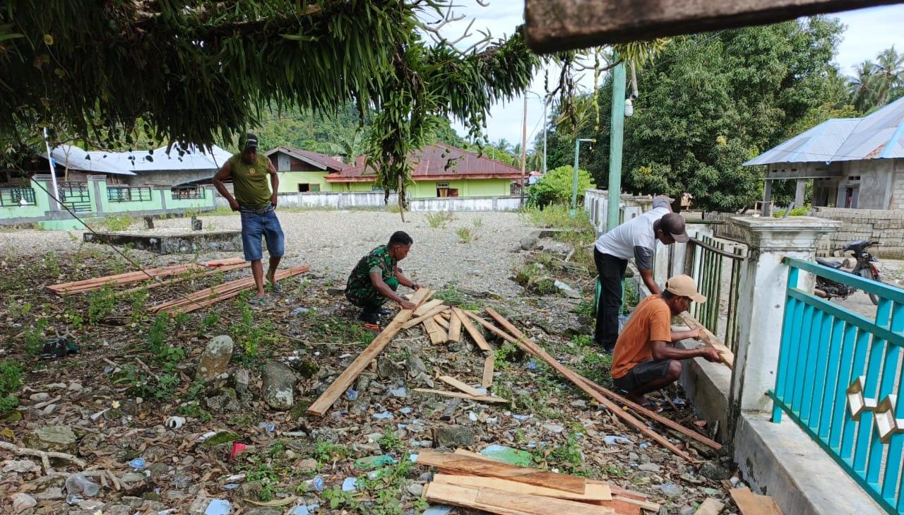 Serda Wahid terlihat aktif bergotong royong bersama warga, baik dalam pekerjaan membongkar pagar lama yang rusak maupun memasang bagian pagar baru.