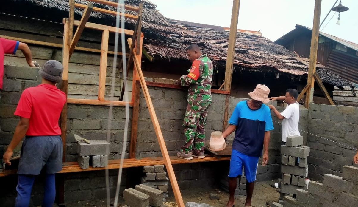 Babinsa bersama masyarakat setempat melaksanakan kegiatan kerja bakti gotong royong membantu pembangunan rumah milik Bapak Abdussalam Lussy, warga Desa Tomalehu, Kecamatan Amalatu, Kabupaten Seram Bagian Barat.