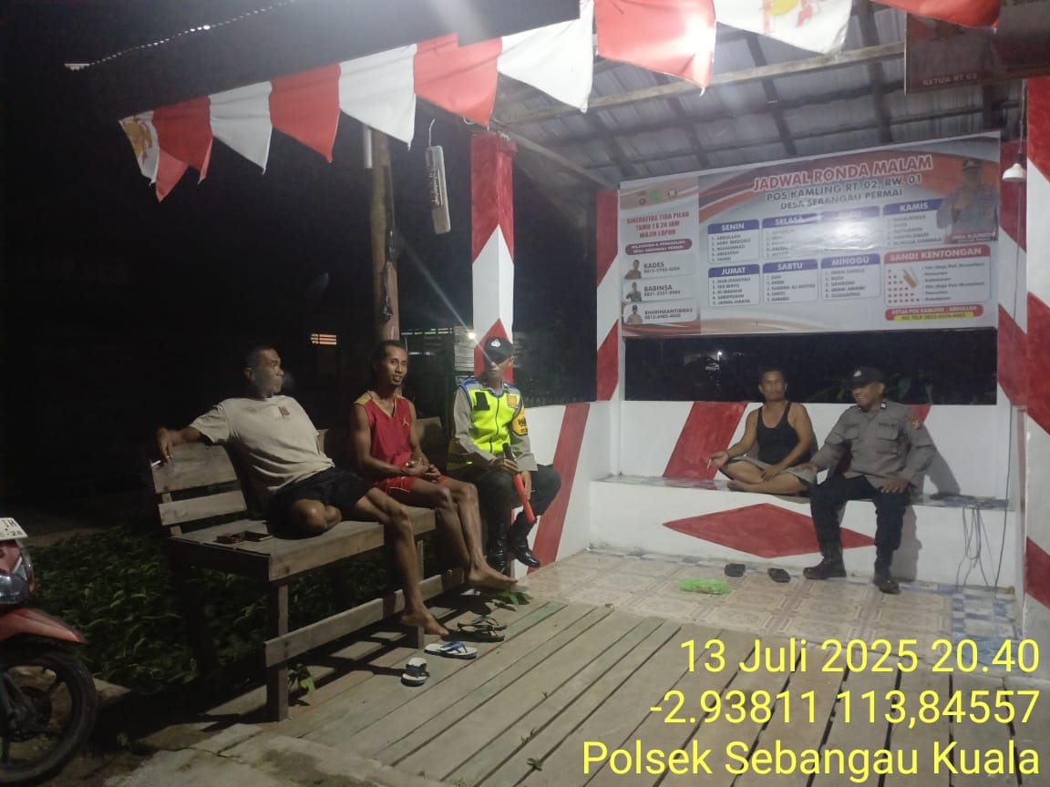 Polsek Sebangau Kuala – Polres Pulang Pisau, Polda Kalteng, memberikan sosialisasi dan imbauan Kamtibmas kepada masyarakat Kecamatan Sebangau Kuala agar turut serta dalam menjaga Kamtibmas agar tetap kondusif, Minggu (13/07/2025) Malam.