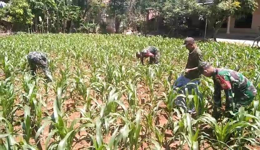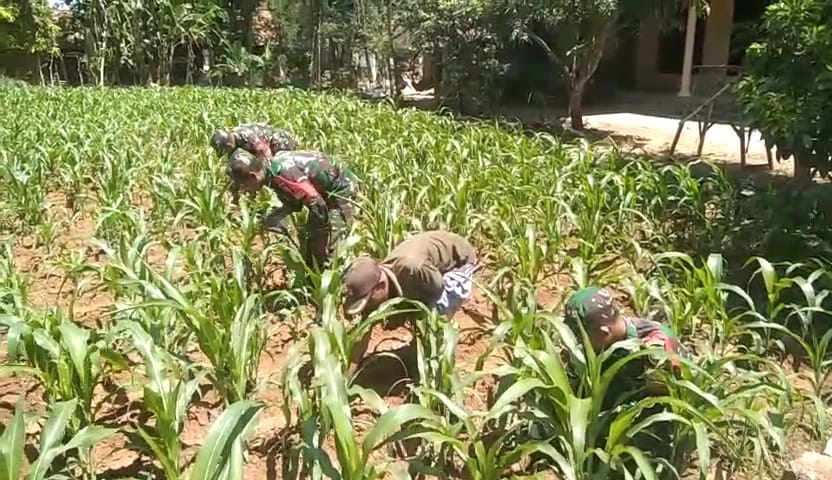 PAMEKASAN – Dalam rangka mendukung program ketahanan pangan nasional, anggota Posramil 0826-12 Kadur terus menunjukkan komitmennya dalam membantu petani di wilayah binaannya. Salah satunya seperti yang dilakukan oleh Babinsa Desa Pamoroh, Serda Anis Daeng dan rekannya yang terjun langsung ke lahan pertanian membantu petani membersihkan rumput liar di sekitar tanaman jagung, Selasa (15/7).