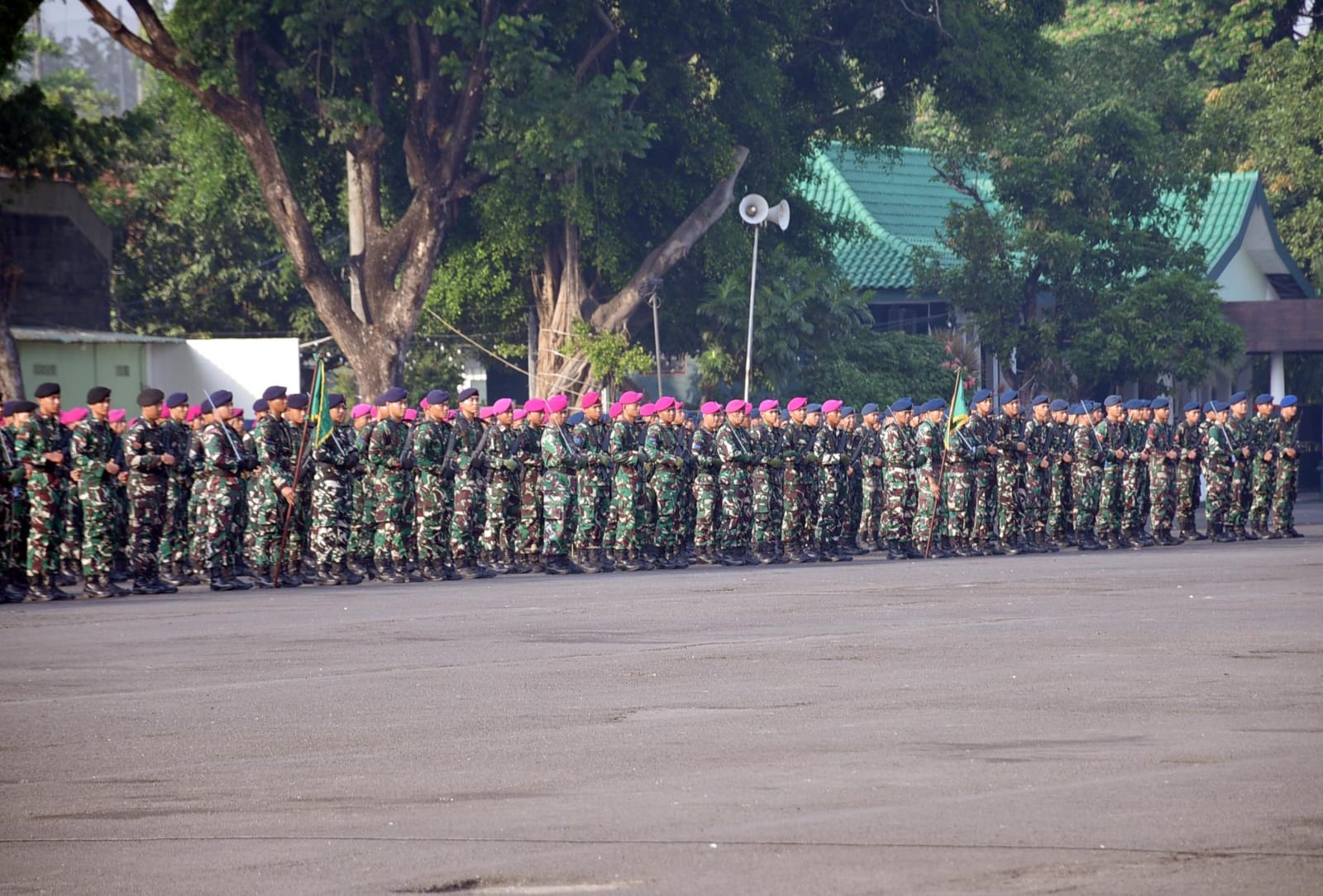 Dispen Kormar, TNI AL (Surabaya) PW : Komandan Pasmar 2 Brigjen TNI (Mar) Nanang Saefulloh, S.E., M.M., bersama prajurit Pasmar 2 mengikuti upacara bendera gabungan wilayah Surabaya tahun 2025, yang digelar di lapangan Makodam V/Brawijaya, Surabaya. Kamis (17/07/2025).