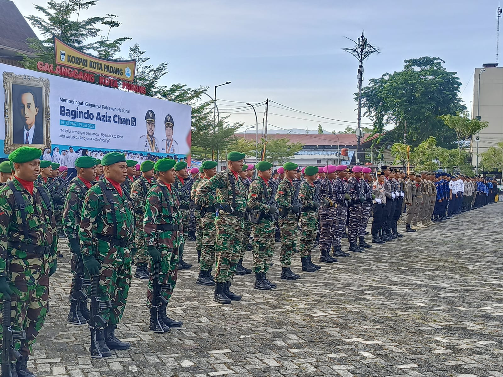 TNI AL, Pasmar 1. Memperingati hari gugurnya seorang pahlawan nasional Bagindo Azis Chan yang ke-78, Prajurit Batalyon Marinir Pertahanan Pangkalan (Yonmarhanlan) II Padang ikut serta Pemerintah Kota Padang bersama unsur Forkopimda dan seluruh elemen masyarakat melaksanakan upacara bendera di Lapangan upacara kantor Wali Kota Padang, Jl. Bagindo Aziz Chan, Aia Pacah, Kota Padang, Sabtu (19/07/2025).